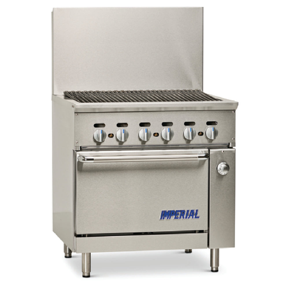 The Imperial IR-36BR-126_LP Pro Series Restaurant Series Range Match Gas is a high-performance appliance designed for demanding professional kitchen environments. Measuring 36 inches in width, this gas-powered range features a powerful charbroiler equipped with cast iron radiants and top grates, ensuring even heat distribution and exceptional grilling results. The unit includes a standard oven with a porcelain interior, which promotes consistent cooking and easy cleaning, accompanied by a chrome rack for versatile baking and roasting options. The design incorporates a grease trough and a removable drip pan to facilitate maintenance and cleanliness. Constructed with a stainless steel front and sides, the range is built to withstand rigorous daily use. Additional features include an 11-inch backguard, a landing ledge, and a kick plate for enhanced functionality and safety. The range stands on 6-inch legs with adjustable feet, allowing for stability and height customization. It operates with a substantial output of 125,000 BTU, equivalent to 37kW, making it suitable for high-volume cooking needs. The unit is NSF certified and meets CSA Flame and CSA Star standards, ensuring compliance with safety and performance regulations. This versatile and durable range is an asset for various segments within the hospitality and foodservice industries.