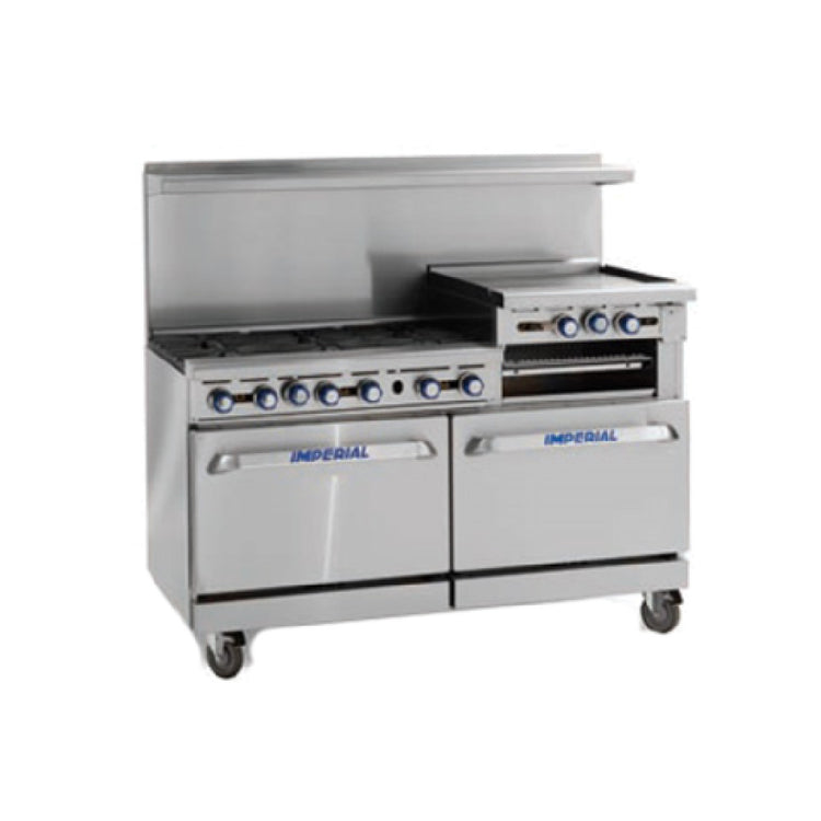 The Imperial IR-6-G24_NAT (MIDDLEBY ESSENTIALS ITEM) Pro Series Restaurant Range is a robust gas-powered culinary appliance, designed for high-demand restaurant environments. With a width of 60 inches, this range features six open burners equipped with pilot lights and a low simmer feature, providing precise temperature control for varied cooking needs. The durable cast iron grates are crafted for longevity and consistent performance. A standout feature is the 24-inch griddle integrated into the range, accompanied by a 3-inch-wide grease trough and removable grease can and crumb tray, ensuring efficient handling of waste. Additionally, this range is equipped with two standard ovens, each lined with a porcelain interior and fitted with a chrome rack, to accommodate a variety of baking and roasting requirements. Manual controls facilitate straightforward operation, while the stainless steel construction of the front, sides, backguard, shelf, landing ledge, and kick plate ensures durability and ease of cleaning. The unit stands on 6-inch legs with adjustable feet, allowing for stable positioning in any kitchen setup. With a powerful output of 302,000 BTU (89 kW), this range is certified by NSF, CE, CSA Flame, and CSA Star, underscoring its adherence to safety and quality standards in food service operations.