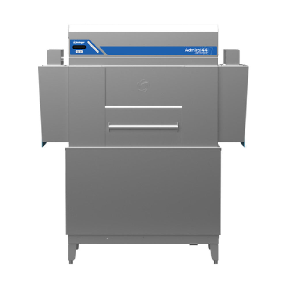 The Insinger ADMIRAL (44'') Single Tank Rack Conveyor Dishwasher Automatic Conveyor is a high-performance dishwashing solution engineered for the food service industry, combining efficiency with advanced technology. This single tank, rack-type dishwasher features a recirculating wash system and a fresh water final rinse, utilizing only 0.63 gallons of water per rack at 20 PSI, making it both water-efficient and cost-effective. Boasting a capacity of 233 racks per hour, or an impressive 5,825 dishes per hour, the ADMIRAL is designed to handle high-volume operations with ease. Its VFD-controlled continuous drive conveyor ensures smooth and consistent operation, while the telescoping doors facilitate efficient daily cleaning, enhancing hygiene and maintenance. The Dual IS Booster System integrated into the machine provides reliable temperature control for optimal sanitation. With these specifications, the Insinger ADMIRAL (44'') is tailored for various sectors within the industry, offering unique value to both small and large-scale operations seeking reliability and efficiency in their dishwashing processes.