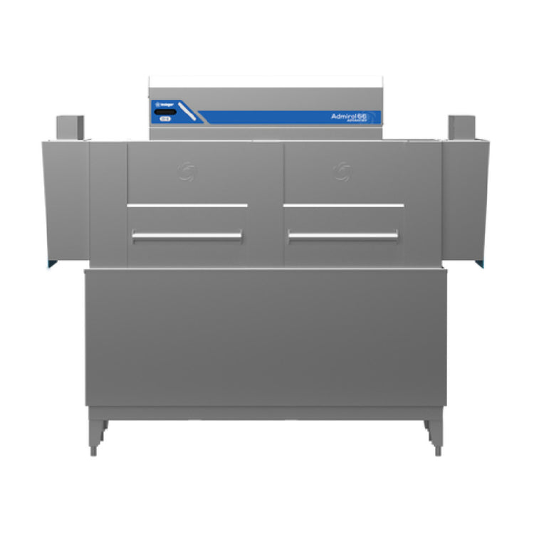 The Insinger ADMIRAL 66 ADVANCED Single Tank Rack Conveyor Dishwasher With Optional VaporGuard System - an efficient solution for high-volume dishwashing needs - integrates cutting-edge features to optimize performance. This single tank dishwasher operates with a recirculating wash and a fresh water final rinse, utilizing just 0.63 gallons per rack at 20 PSI, making it both economical and eco-friendly. Capable of processing up to 233 (20” x 20”) racks per hour or a staggering 5,825 dishes per hour, this dishwasher is ideal for large-scale food service operations. It features a VFD-controlled continuous drive conveyor for smooth dish handling and includes the VaporGuard Condensation Removal System to enhance operational efficiency by reducing moisture buildup. The telescoping doors facilitate easy daily cleaning, ensuring hygiene standards are maintained. Additionally, its dual IS Booster System is built-in, eliminating the need for an external hood, although local building codes should be consulted. This dishwasher's robust design and advanced technology make it suitable for diverse market segments, from high-capacity restaurants to institutional kitchens, offering reliability and efficiency in demanding environments.