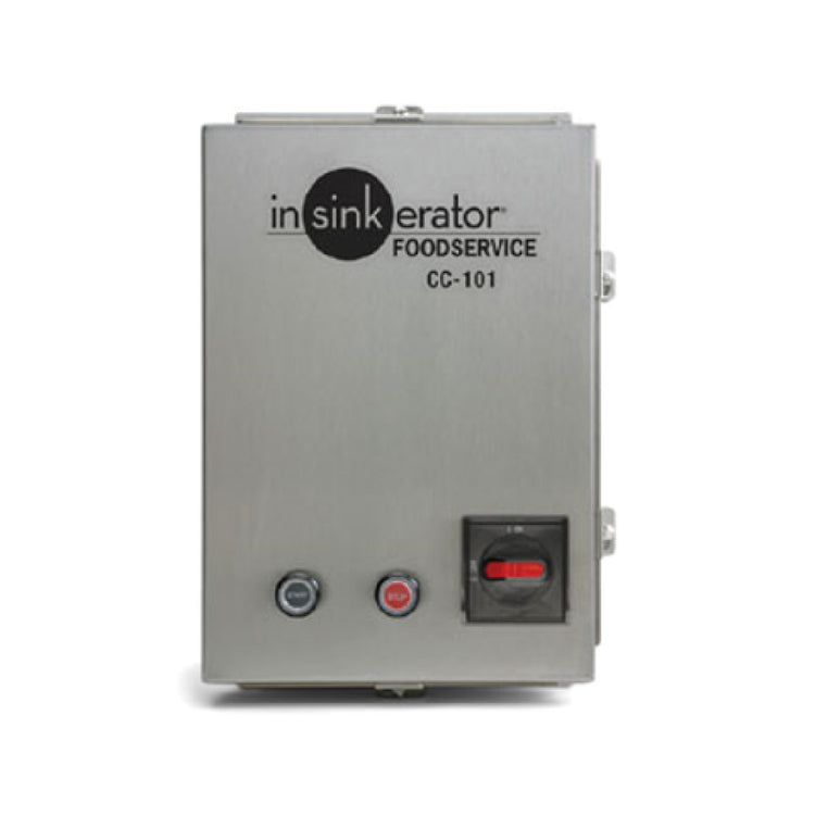 InSinkErator CC101K-5 CC-101 Control Center is an advanced unit designed for seamless integration with SS-50 to SS-200 disposers. This control center stands out with its automatic reverse functionality, reducing the risk of jams and ensuring longevity and reliability in high-demand environments. Equipped with start/stop push buttons, it offers straightforward operation, enhancing safety and efficiency. The control center is housed in a robust NEMA 4 stainless steel enclosure, providing excellent protection against environmental factors and ensuring durability in diverse installation conditions. It operates on a 120v/50/60/1-ph electrical system, offering compatibility with standard electrical setups. This unit is cULus certified, guaranteeing compliance with rigorous safety standards, and it replaces the previous CC101K-1 model, signifying improved features and performance. The InSinkErator CC101K-5 is an indispensable component for commercial kitchens, catering to various market segments by delivering reliable control and operation for food waste disposers, making it an ideal choice for businesses seeking efficiency and reduced downtime.