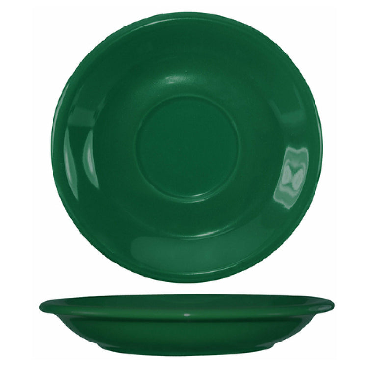 The International Tableware 81376-67S Bistro Saucer 6-1/4" Dia. Round is an expertly crafted piece designed for both aesthetic appeal and practical functionality. Measuring 6-1/4 inches in diameter, this round saucer is made from lead-free ceramic, ensuring a safe dining experience. Its fully vitrified construction enhances durability, making it resistant to chipping and cracking. This green Cancun™ saucer is both microwave and dishwasher safe, offering convenience for fast-paced environments or everyday use. Ideal for pairing with the International Tableware 81376/822 cups, this saucer is a versatile addition to any table setting. Packaged by three dozen per case, it is suitable for commercial settings, such as restaurants, cafés, and hotels, looking to maintain inventory with ease. The International Tableware 81376-67S Bistro Saucer combines style and practicality, making it a valuable choice for any food service industry professional seeking reliable and attractive tableware solutions.
