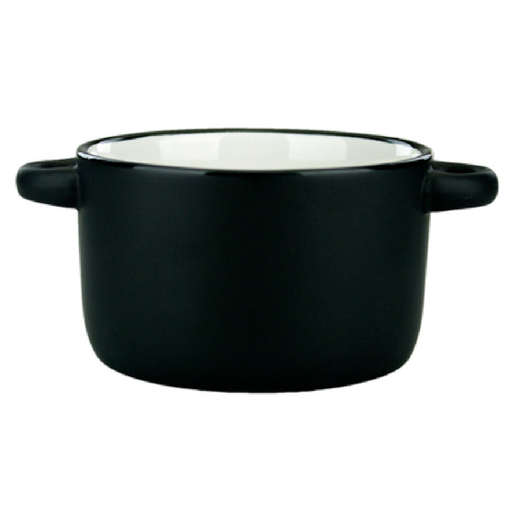 The International Tableware 83567-02/05MF-05C Bistro Soup Bowl 11 Oz. 5-5/8"dia. X 2-3/8"H is a versatile piece of tableware designed for both functionality and style. With a capacity of 11 ounces, this bowl is perfectly sized for serving soups and other delicious concoctions. Its dimensions of 5-5/8 inches in diameter and 2-3/8 inches in height provide a practical and elegant serving solution. The bowl extends to a width of 5-3/4 inches thanks to its convenient handles, enhancing usability. Constructed from fully vitrified stoneware, it boasts durability and resilience, being oven, microwave, and dishwasher safe, which makes it highly adaptable to various dining environments. The lead-free construction aligns with safety standards, adding a layer of consumer confidence. The aesthetic appeal is amplified by its black matte exterior paired with a contrasting white interior, part of the distinctive Hilo® collection. Each package contains one dozen bowls, making it ideal for both small and large dining establishments seeking consistency and quality. This bowl serves as a practical and stylish addition to any professional kitchen or home dining setting, offering a unique value proposition for those in the food service industry looking for reliable and attractive tableware solutions.