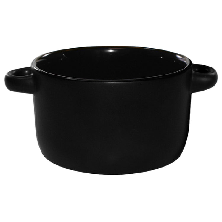 The International Tableware 83567-05/05MF-05C Bistro Soup Bowl is a meticulously crafted dining essential with a capacity of 11 oz., designed to cater to the diverse needs of the food service industry. The bowl measures 5-5/8" in diameter and 2-3/8" in height, with an overall width of 5-3/4" when including the handles. This round stoneware piece features a sophisticated black matte exterior coupled with a sleek black interior, adding a touch of modern elegance to any table setting. As a fully vitrified product, the bowl is both lead-free and exceptionally durable, ensuring long-lasting performance in professional kitchens. Its versatility is highlighted by its oven, microwave, and dishwasher safe properties, making it a practical choice for both storage and service. The International Tableware 83567-05/05MF-05C Bistro Soup Bowl, part of the Hilo® collection, is packed by the dozen, offering a comprehensive solution for restaurants, cafes, and catering services seeking reliable and stylish tableware. This bowl's thoughtful design and robust construction provide a unique value proposition, emphasizing functionality and aesthetic appeal in a variety of culinary environments.