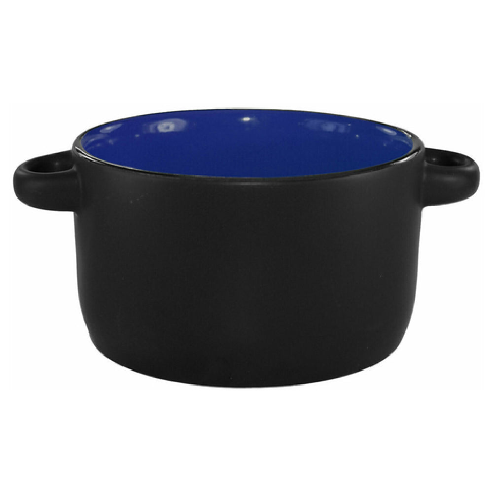 The International Tableware 83567-2899/05MF-05C Bistro Soup Bowl is a versatile dining solution, expertly crafted for a range of hospitality settings. This soup bowl boasts an 11 oz. capacity, making it ideal for serving a variety of soups, stews, and broths. With a diameter of 5-5/8 inches and a height of 2-3/8 inches, this bowl is designed with practicality in mind, featuring a width of 5-3/4 inches with handles, providing ease of handling for both servers and diners. The bowl's construction is robust and reliable, made from fully vitrified stoneware, ensuring it is lead-free and safe for use in oven, microwave, and dishwasher environments. Its striking black matte exterior paired with a country blue interior offers a modern and sophisticated aesthetic, enhancing the presentation of the culinary creations it holds. The Hilo® series design underscores its durability and style, making it a standout piece in any tableware collection. This bowl is packaged by the dozen, catering to the demands of bustling restaurants and catering services, where maintaining high standards of quality and consistency is paramount. The International Tableware Bistro Soup Bowl is a reliable and stylish choice for any professional food service operation.