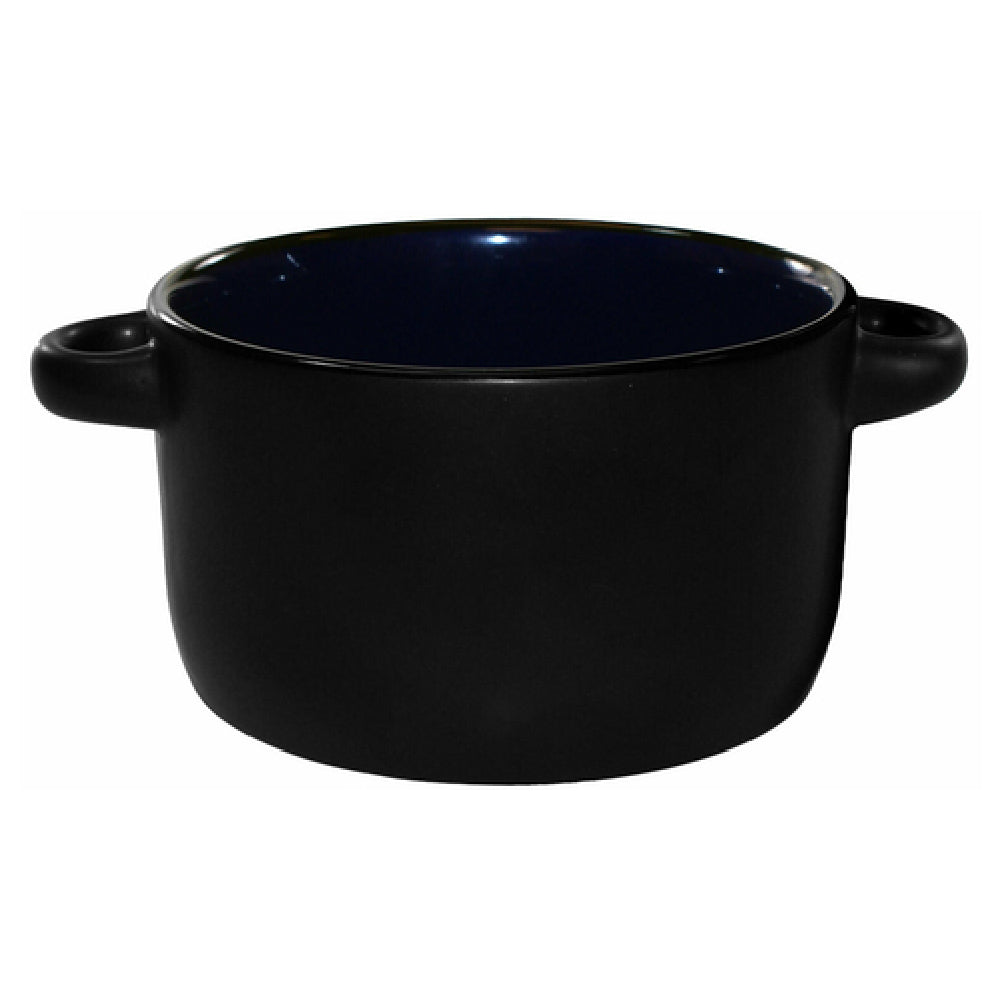 The International Tableware 83567-2901/05MF-05C Bistro Soup Bowl is a meticulously crafted piece designed for versatile use in both domestic and professional settings. With a capacity of 11 oz., this bowl measures 5-5/8 inches in diameter and 2-3/8 inches in height, providing ample space for serving soups and other culinary delights. The bowl extends to a width of 5-3/4 inches with handles, ensuring a comfortable grip during handling. Made from fully vitrified stoneware, this bowl is both durable and safe, as it is lead-free and can be used in ovens, microwaves, and dishwashers. Its robust construction is complemented by an aesthetically pleasing design, featuring a matte black exterior and a striking cobalt blue interior, which is part of the Hilo® collection. Sold in a pack of one dozen, this bistro soup bowl is an ideal choice for restaurants, cafes, and catering services that demand both style and functionality in their tableware. Its unique combination of features makes it a valuable addition to any dining establishment, offering reliability and elegance in one package.