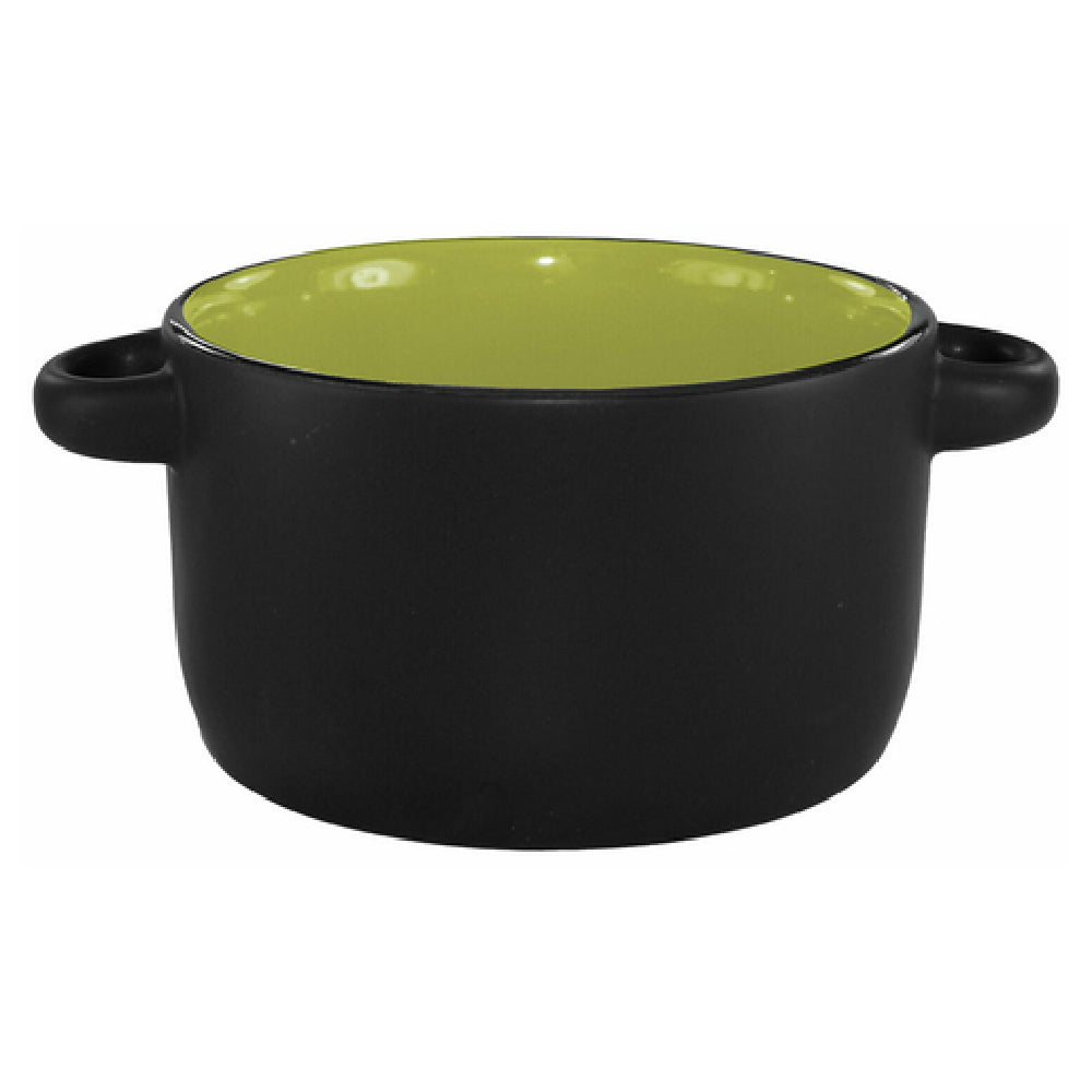 The International Tableware 83567-2902/05MF-05C Bistro Soup Bowl is a meticulously designed piece of tableware that combines functionality with aesthetic appeal, catering to the needs of various market segments in the dining industry. This bowl boasts an 11-ounce capacity, providing ample space for serving soups, stews, and other liquid-based dishes. With dimensions of 5-5/8 inches in diameter and 2-3/8 inches in height, it ensures convenient handling and storage. The design is enhanced by the inclusion of handles, extending the width to 5-3/4 inches, which facilitates ease of use in both home and professional settings. Constructed from fully vitrified stoneware, this bowl is lead-free, ensuring safety and durability for repeated use. Its black matte exterior paired with a rye green interior offers a sophisticated, modern aesthetic that complements various dining decors. The bowl's versatility is further demonstrated by its oven, microwave, and dishwasher safeness, making it a practical choice for busy kitchens. Part of the Hilo® collection, it is packaged in quantities of one dozen, optimizing stocking and inventory management for restaurants and catering services. This combination of design, functionality, and safety makes the International Tableware Bistro Soup Bowl a valuable addition to any dining environment.