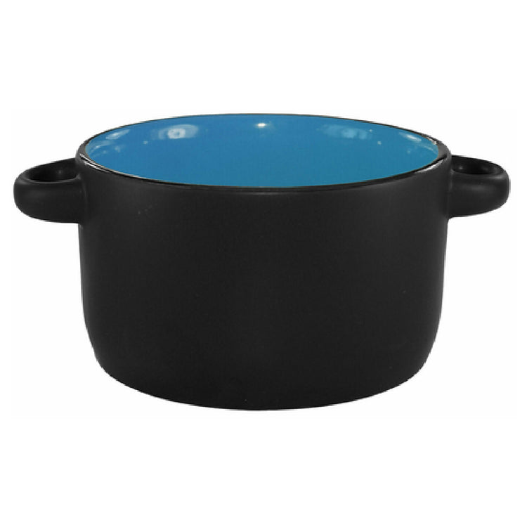 The International Tableware 83567-2903/05MF-05C Bistro Soup Bowl is a meticulously crafted piece, designed to elevate the dining experience across various segments of the food industry. This soup bowl boasts a capacity of 11 ounces, ideally suited for serving moderate portions of soups or stews. With precise dimensions of 5-5/8 inches in diameter and 2-3/8 inches in height, and an extended width of 5-3/4 inches with handles, it offers a practical yet stylish solution for professional kitchens and casual dining environments alike. The bowl's round shape, combined with its stoneware composition, ensures durability, while its fully vitrified body guarantees a non-porous surface that resists chips and scratches. The exterior features a sophisticated black matte finish, complemented by a vibrant sky blue interior, enhancing table presentation. This bistro soup bowl is oven, microwave, and dishwasher safe, providing versatility and convenience for food service operators. Additionally, the product is lead-free, adhering to safety standards crucial for health-conscious establishments. Packed by the dozen under the Hilo® line, it represents a blend of functionality and aesthetic appeal, making it a versatile choice for restaurants, cafes, and catering services seeking reliable and elegant tableware solutions.