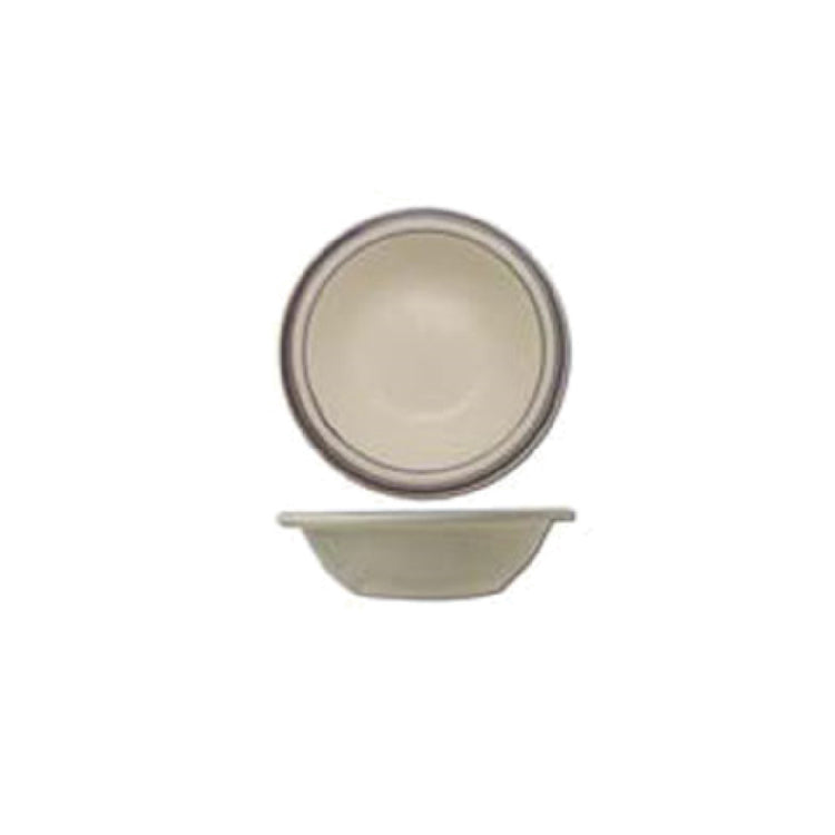 The International Tableware CT-10 Grapefruit Bowl 13 Oz. is a meticulously crafted ceramic dish, ideal for various industry segments such as hospitality, catering, and foodservice. With a diameter of 6-5/8 inches and a height of 1-3/4 inches, this round bowl is perfectly sized for serving grapefruit or similarly portioned dishes. The bowl features a rolled edge, enhancing durability and providing a classic, finished appearance. It is both microwave and dishwasher safe, ensuring convenience and efficiency in fast-paced environments. The CT-10 is lead-free, prioritizing safety and health standards, and comes in American White with a distinct blue band, adding a touch of elegance and tradition to any table setting. Offered in the Catania™ collection, it is packaged by 3 dozen per case, catering to the needs of larger establishments. This grapefruit bowl combines aesthetic appeal with practical functionality, appealing to restaurateurs, event planners, and culinary experts seeking reliable and attractive tableware solutions.