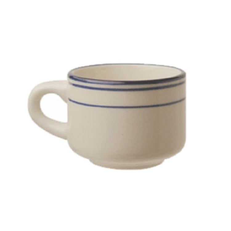 The International Tableware CT-23 Cup 7 Oz. 3-1/4" Dia. X 2-1/2" H is an expertly crafted ceramic cup designed for versatility and practicality in various dining settings. With a capacity of 7 ounces, this round cup is ideal for serving a range of beverages, from coffee to tea. Its dimensions, with a diameter of 3-1/4 inches and a height of 2-1/2 inches, offer an ergonomic and comfortable handling experience, further enhanced by a sturdy handle. The stackable design facilitates efficient storage, making it a space-saving solution for busy environments such as cafes, restaurants, and catering services. The cup is both microwave and dishwasher safe, ensuring ease of use and maintenance. Made from lead-free ceramic, it prioritizes safety and durability, while its American White color with a blue band provides a classic and appealing aesthetic. Part of the Catania™ collection, this cup comes packed in cases of three dozen, catering to the demands of high-volume establishments. Whether furnishing a bustling diner or enhancing the ambiance of a quaint bistro, the International Tableware CT-23 Cup delivers functionality and elegance, meeting the diverse needs of the food service industry.