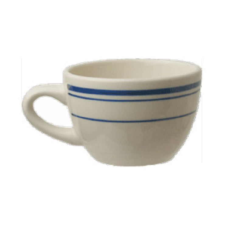 International Tableware CT-37 Cup 8 Oz. 3-7/8" Dia. X 2-1/2"H is a versatile and durable piece of ceramic tableware designed to meet the needs of diverse market segments within the food service industry. With a low, round shape and an ergonomic handle, this cup is engineered for both comfort and style, enhancing the drinking experience. Its dimensions of 3-7/8 inches in diameter and 2-1/2 inches in height provide an ideal capacity of 8 ounces, perfect for serving coffee, tea, or other beverages in both casual and formal dining settings. This cup is microwave and dishwasher safe, ensuring easy maintenance and convenience for busy kitchens. Constructed from lead-free ceramic, it prioritizes safety and health standards, making it a reliable choice in any environment. The American White finish with a distinctive blue band, part of the Catania™ collection, adds a touch of elegance and sophistication to your table settings. Packed by three dozen per case, it is a practical solution for restaurants, cafes, and catering services seeking uniformity and quality. The International Tableware CT-37 Cup seamlessly combines functionality, safety, and aesthetic appeal, making it an invaluable asset for establishments aiming for excellence in dining presentation.