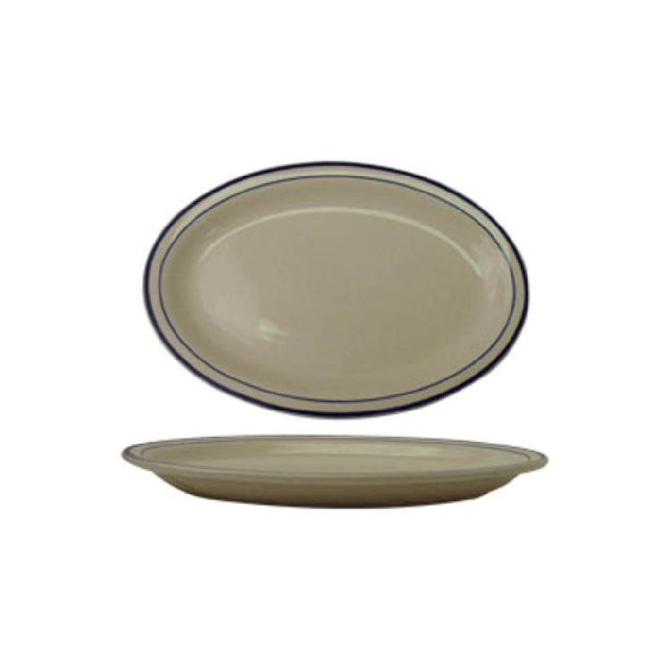 International Tableware DA-12 Platter 9-3/4" x 7-1/2" Oval is a ceramic serving solution that melds practicality with aesthetic appeal, ideal for various segments in the food service industry. With dimensions of 9-3/4 inches by 7-1/2 inches, this platter offers ample space for serving appetizers, entrees, or shared dishes, making it suitable for both casual and fine dining establishments. Its oval shape with a narrow rim is designed to enhance the presentation of culinary creations, adding a subtle elegance to any table setting. The platter's American White color, accented with a distinctive Blue speckle and rim, complements a range of dining decor. Engineered for convenience, this platter is both microwave and dishwasher safe, ensuring efficient service and cleanup processes. It is lead-free, aligning with safety standards for food contact materials, providing peace of mind for both operators and diners. The Danube™ design, packaged 2 dozen per case, offers value for bulk purchasing, catering to the needs of restaurants, hotels, and catering services. This versatile and durable platter is an essential component for professionals seeking to elevate the dining experience while maintaining practical service solutions.
