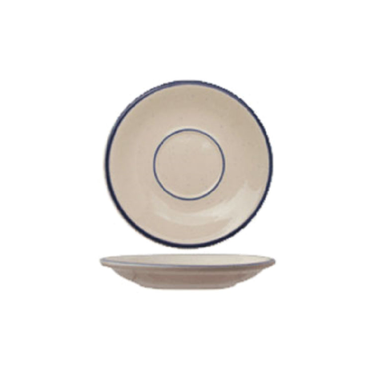 The International Tableware DA-2 Saucer 5-1/2" Dia. Round is a meticulously crafted piece of ceramic tableware that combines both functionality and style, making it suitable for various market segments, including restaurants, cafes, and hospitality services. This saucer measures 5-1/2 inches in diameter and features a sophisticated round shape with a narrow rim, ensuring a refined aesthetic. Engineered to be microwave and dishwasher safe, it provides convenience and durability for high-volume food service operations. The DA-2 Saucer is lead-free, adhering to safety standards and ensuring a safe dining experience. It is designed in American White with an elegant blue speckle and rim, part of the Danube™ collection, which harmonizes with other pieces such as DA-1, DA-4, and DA-17, making it an ideal choice for establishments that prioritize cohesive table settings. Each case contains three dozen saucers, facilitating bulk purchasing for commercial use. This saucer offers practicality and visual appeal, making it a valuable addition to any dining environment that seeks to enhance its service with durable and attractive tableware solutions.