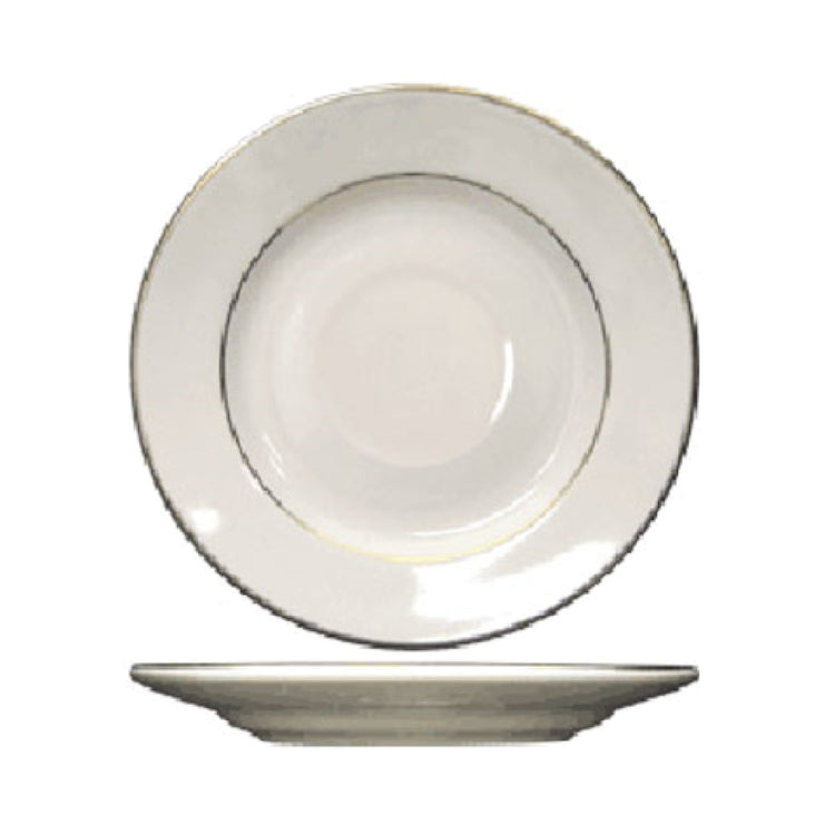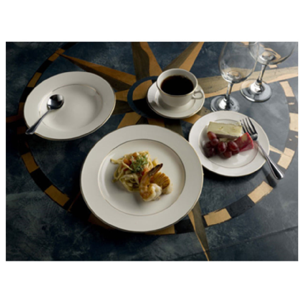 The International Tableware FL-2GF Saucer 5-3/4" Dia. Round is a meticulously crafted piece of tableware designed to enhance the dining experience with its elegant and functional design. Measuring 5-3/4 inches in diameter, this round saucer is an ideal companion for cups, specifically tailored for models FL-1 and FL-4. The highly polished foot of the saucer not only adds a touch of sophistication but also ensures stability during use. This saucer is crafted from ceramic, known for its durability and ability to withstand frequent use, making it suitable for both casual and formal dining settings. The American White finish with a striking gold band adds a timeless aesthetic, appealing to fine dining establishments and upscale cafes. Notably, the saucer is lead-free and dishwasher safe, emphasizing safety and convenience for users who prioritize hygiene and easy maintenance. Packed by three dozen per case, this saucer is a practical choice for restaurants and hospitality venues requiring bulk purchases. Its compatibility within the Florentine™ collection allows for a cohesive and elegant table presentation. The International Tableware FL-2GF Saucer represents a blend of quality and style, catering to diverse market segments within the food service industry that value both function and aesthetic appeal.