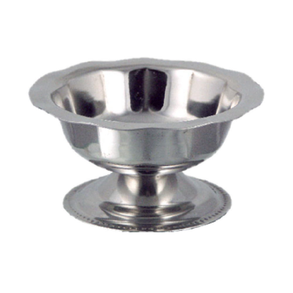 The International Tableware IDS-I-HG7 Sherbet Dish 5 Oz. 4" Dia. X 2"H stands out as a quintessential piece of stainless steel holloware, meticulously designed for both elegance and durability. Crafted with a .7mm thickness, this dish embodies a refined balance of lightweight construction and lasting sturdiness, making it suitable for a wide range of dining settings. At 4 inches in diameter and 2 inches in height, it offers a compact yet ample serving size, ideal for individual portions of delectable sherbet or other desserts. The high gadroon base adds a touch of sophistication, enhancing the dish's aesthetic appeal while providing stability on any tabletop. Its premium stainless steel composition ensures resistance to corrosion and easy maintenance, proving advantageous for high-volume environments like restaurants, hotels, and catering services. Packed in sets of a dozen, it offers both convenience and value for establishments looking to maintain a consistent presentation across their service. Whether used in a bustling banquet hall or a cozy café, the International Tableware IDS-I-HG7 Sherbet Dish combines practicality with style, meeting the diverse needs of the hospitality industry with finesse.