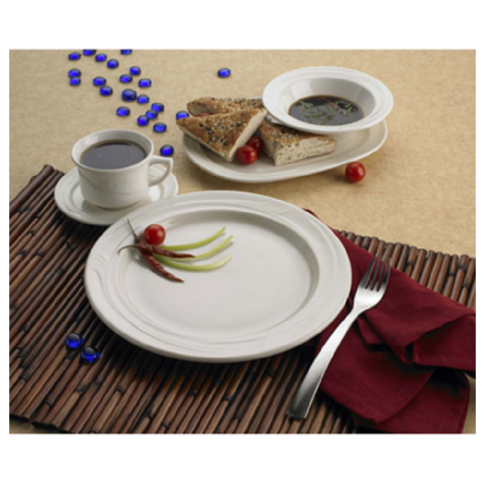 The International Tableware NP-10 Grapefruit Bowl is an expertly crafted piece of ceramic tableware with an 8-ounce capacity, ideal for serving citrus fruits, desserts, or small salads in both commercial and residential settings. This round bowl measures 6-3/8 inches in diameter and 1-3/4 inches in height, ensuring ample space while maintaining a sleek profile. The bowl is distinguished by its embossed design and features a rolled edge that adds a touch of elegance and durability, making it suitable for frequent use. Its highly polished foot provides stability and a refined finish that complements a variety of table settings. Designed to withstand the rigors of modern kitchens, this bowl is both microwave and dishwasher safe, promising convenience and ease of maintenance. Additionally, it is lead-free, aligning with health and safety standards. Rendered in American White, the NP-10 is part of the Newport™ collection, offering a timeless and versatile aesthetic. This product is packed by three dozen per case, making it a practical and economical choice for restaurants, hotels, and catering services looking to enhance their dining presentations with quality tableware.