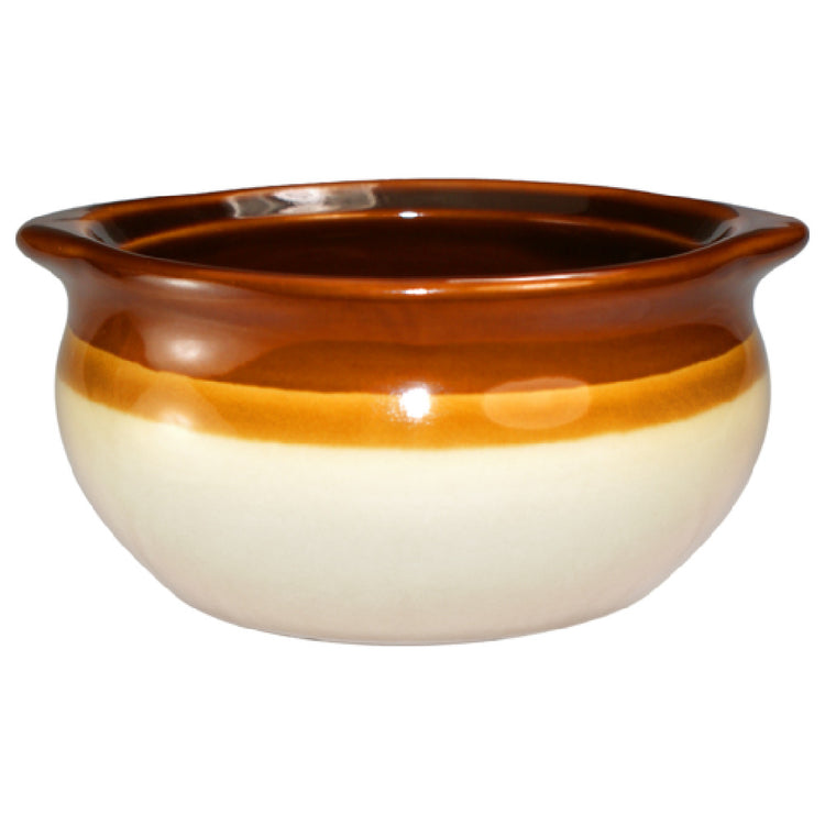 The International Tableware OSC-15 Soup Crock is a versatile and durable solution for serving soups and similar dishes in a variety of settings. It offers a practical volume of 12 ounces, with a diameter of 5-1/4 inches and a height of 2-3/8 inches, making it a suitable choice for single servings. Its round design is not only aesthetically pleasing but also functional, optimizing the space it occupies. Made from high-quality stoneware-ceramic, this soup crock is lead-free, ensuring safe use in food service environments. It is oven safe up to 450°F, allowing for the preparation or reheating of dishes directly in the crock. Additionally, this product is microwave and dishwasher safe, providing convenience in both cooking and cleaning processes. The crock comes in an attractive American White with caramel and beige accents, adding a touch of elegance to any table setting. This product is packed by 4 dozen per case, which highlights its suitability for large-scale operations such as restaurants, catering services, and institutional kitchens. The International Tableware OSC-15 Soup Crock seamlessly combines functionality with style, making it a valuable addition to any food service establishment that requires reliable and attractive tableware.