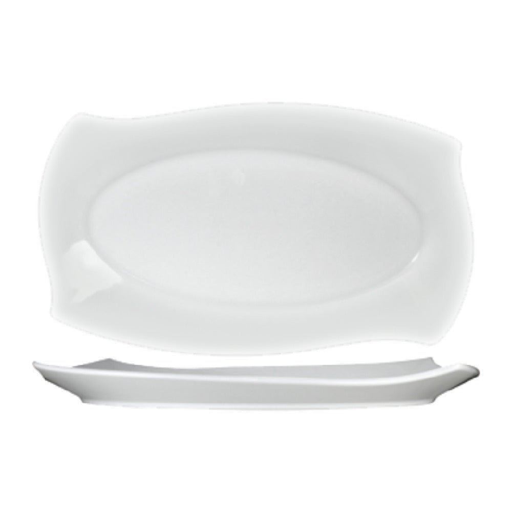The International Tableware RA-13 Platter is an oval dish measuring 12 inches by 7 inches with a height of 1-1/4 inches. Characterized by its signature shape rim, this platter is an attractive choice for restaurants, catering services, and home dining. Crafted from fully vitrified porcelain, it is lead-free, ensuring safety and durability when serving food. The platter's Bright White finish enhances its visual appeal, making it a versatile addition to any table setting. The RA-13 Platter's ability to withstand both microwave and dishwasher use makes it incredibly practical for fast-paced environments, where efficiency and ease of cleaning are paramount. This platter is part of the Rhapsody™ collection and is packed by the dozen, making it a convenient option for large-scale dining operations or for those looking to stock up on high-quality tableware. Whether being used in a bustling restaurant or a quiet family meal at home, the International Tableware RA-13 Platter combines elegance with durability, catering to a wide array of dining scenarios. Its thoughtful design and superior material quality make it a reliable choice for any culinary setting.