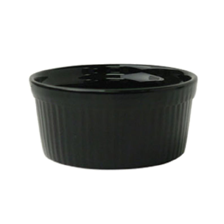 The International Tableware RAMF-2-B Ramekin 2 Oz. is a versatile piece designed for both professional kitchens and home dining experiences. With its compact dimensions of 2-3/4" diameter and 1-3/8" height, it is perfect for serving small portions, sauces, or condiments. The round, fluted design not only adds a touch of elegance but also enhances grip and ease of handling. Made from high-quality ceramic, this ramekin is lead-free, ensuring safe food contact. It boasts impressive durability, being oven safe up to 450°F, and is also microwave and dishwasher safe, providing convenience in busy kitchen environments. Its sleek black Cancun™ color adds a modern aesthetic, making it suitable for various dining settings. Packed by three dozen per case, it supports large-scale food service operations and culinary establishments. The International Tableware RAMF-2-B Ramekin 2 Oz. combines practicality with style, making it an essential addition to any culinary ensemble.