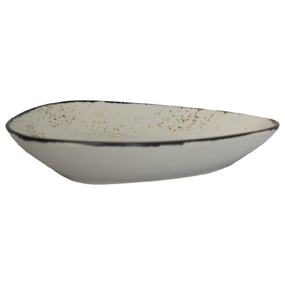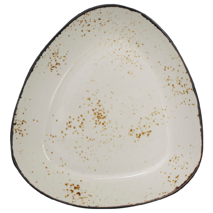 The International Tableware SH-120-CR Pasta/Salad Bowl is an expertly crafted serveware piece designed for culinary presentations with precision. Measuring 10-3/8 inches in diameter and 1-1/2 inches in height, this bowl has a generous 32 oz. capacity, catering to ample servings of pasta or salad. Its unique organic triangle shape presents a contemporary aesthetic while ensuring versatility in food presentation. Constructed from fully vitrified stoneware, it guarantees durability and resistance to moisture absorption, enhancing its lifespan in commercial settings. The hand-painted reactive glaze finish adds a touch of artisanal craftsmanship, featuring a crème base accentuated by dark brown trim and speckles, providing a rustic yet elegant appeal. The bowl is part of the Splash™ collection, meticulously packed by the dozen, making it a practical choice for restaurants, cafes, and catering services looking for functional yet stylish serveware. This bowl exemplifies a blend of functionality and design, suitable for different market segments within the foodservice industry, from high-end dining establishments to casual eateries, offering an enduring solution for serving needs. Its design and material composition also ensure it maintains a professional appearance even with frequent use, thereby enhancing the dining experience.