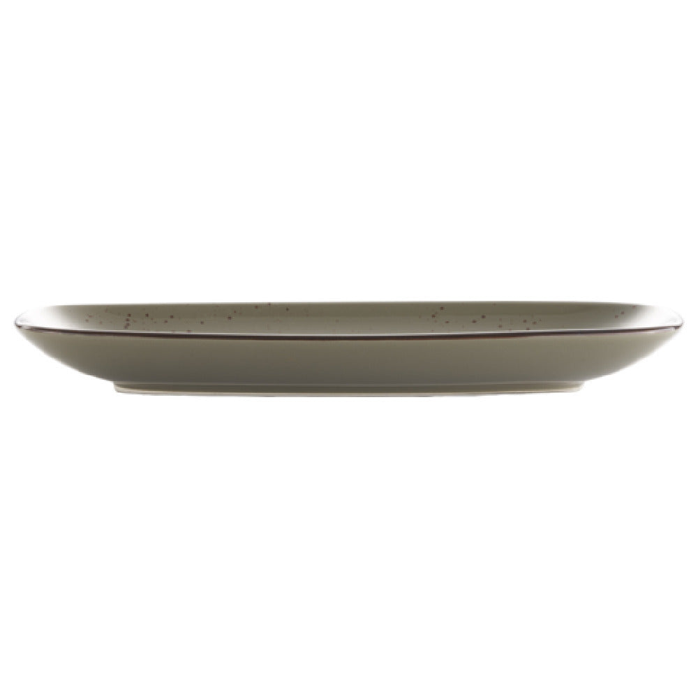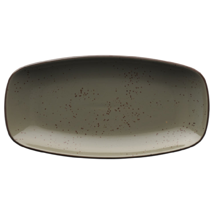 The International Tableware SH-13-GS Platter 11-5/8"L x 5-7/8"W Organic Rectangle is an exquisitely designed piece, perfectly suited for a range of dining settings. Constructed from stoneware, this platter is fully vitrified, enhancing its durability and resistance to cracking, which is vital for high-traffic environments such as restaurants and catering services. The organic rectangular shape offers a unique aesthetic, complementing modern dining presentations. Each platter is finished with a hand-painted reactive glaze, showcasing a distinctive Green Smoke hue accented by a Dark Brown Trim and Speckles, adding an artisanal touch that appeals to upscale dining establishments. This platter is part of the Splash™ collection and comes packed by the dozen, making it a practical choice for businesses requiring consistency in presentation and quality. The International Tableware SH-13-GS Platter combines functionality with elegance, meeting the needs of different market segments within the hospitality industry, from casual dining to high-end culinary experiences.