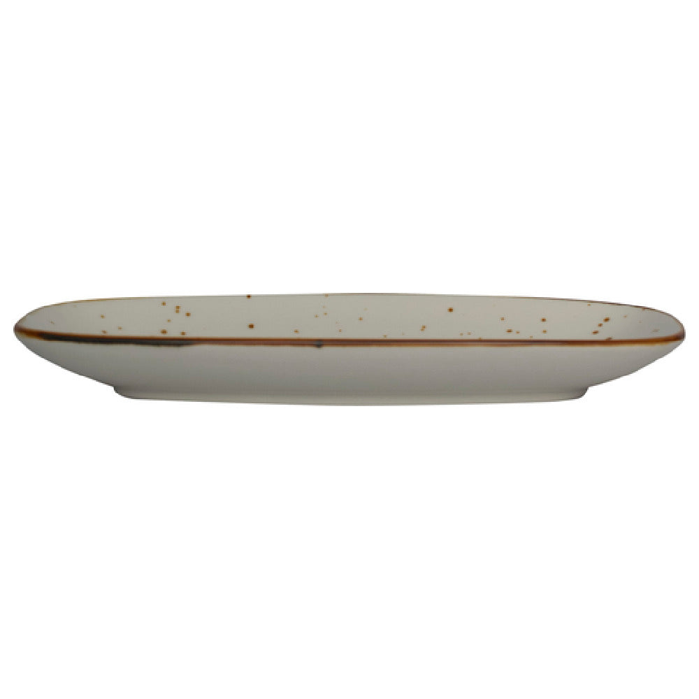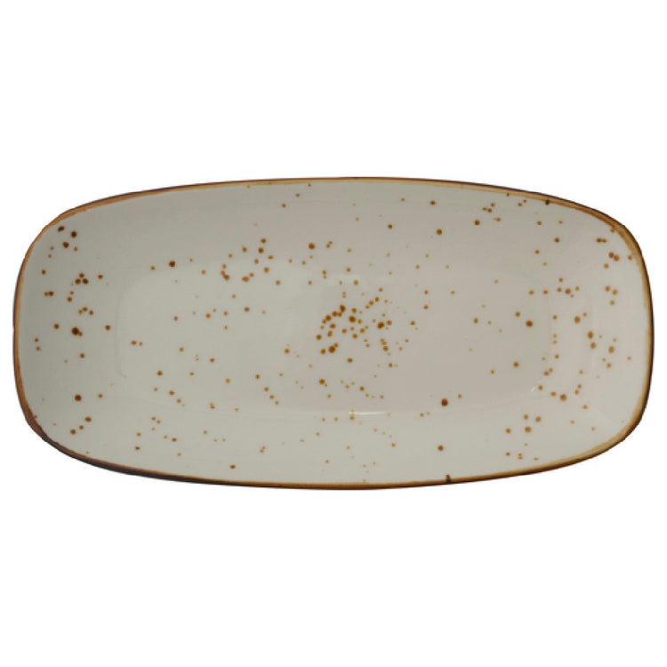 The International Tableware SH-34-CR Platter 9"L x 4-3/8"W Organic Rectangle is a meticulously crafted piece of stoneware that showcases the perfect blend of functionality and aesthetic appeal. Measuring 9 inches in length and 4-3/8 inches in width, this platter is designed with an organic rectangle shape, providing a distinctive yet versatile presentation for a variety of culinary creations. The stoneware is fully vitrified, a process that enhances its strength and ensures a non-porous finish, making it resistant to chips and stains. This platter features a hand-painted reactive glaze finish, giving each piece a unique appearance with a crème base, accented by dark brown trim and speckles, adding a touch of sophistication to any dining setting. Ideal for upscale restaurants, catering services, and home dining, the International Tableware SH-34-CR Platter is packaged by 2 dozen per case, offering considerable value for large-scale operations. Its durable construction and elegant design make it a favored choice among professionals seeking both practicality and style in their serveware solutions.