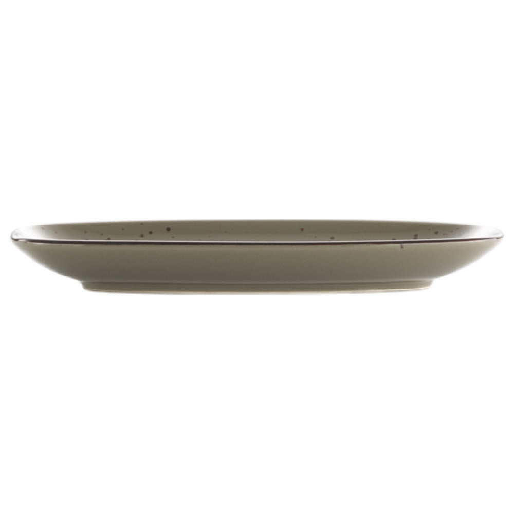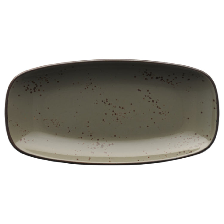 The International Tableware SH-34-GS Platter is an elegantly designed organic rectangle platter measuring 9 inches in length and 4-3/8 inches in width, crafted to complement various dining environments. This platter is constructed from stoneware that is fully vitrified, ensuring exceptional strength and durability, which is ideal for both casual and formal settings. It is enhanced with a hand-painted reactive glaze finish, showcasing a unique Green Smoke color accented by a Dark Brown Trim and Speckles for a sophisticated appearance. The distinctive Splash™ design adds aesthetic appeal, making it a standout piece in any tableware collection. The platter is packed with practicality, being packaged by 2 dozen per case, which suits large-scale hospitality establishments, catering businesses, and restaurants looking to maintain a consistent presentation across multiple servings. Its robust construction and innovative design cater to the needs of different segment markets within the food service industry, offering a perfect blend of functionality and style.
