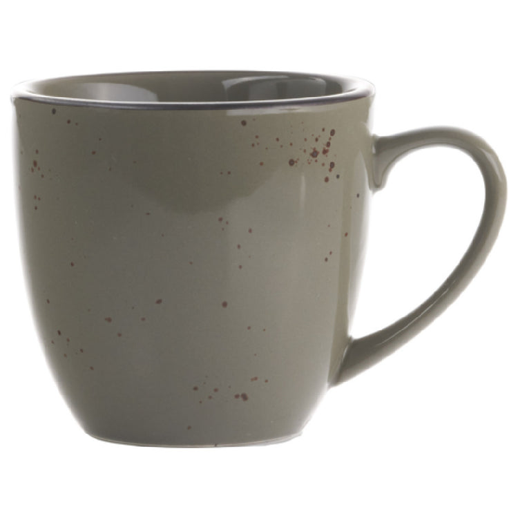 The International Tableware SH-57-GS Cup 3-5/8"D x 3-1/4"H 10.5 Oz. is a stoneware cup designed for both aesthetic appeal and practical functionality. This cup features a robust construction, fully vitrified to ensure durability and longevity, making it suitable for high-use environments such as restaurants, cafes, and hotels. The hand-painted reactive glaze finish enhances its visual appeal, with a Green Smoke color complemented by Dark Brown Trim and Speckles, adding a touch of elegance to any table setting. Measuring 3-5/8 inches in diameter and 3-1/4 inches in height, this cup has a capacity of 10.5 ounces, ideal for serving a variety of beverages. It is designed with a comfortable handle for easy handling and fits seamlessly with the SH-68-GS Double Well Saucer, providing a complete serving solution. The packaging, consisting of 2 dozen per case, makes it convenient for bulk purchases and large-scale operations. This cup combines form and function, making it a versatile choice across various market segments within the hospitality industry, offering a stylish option that meets the practical demands of everyday service.