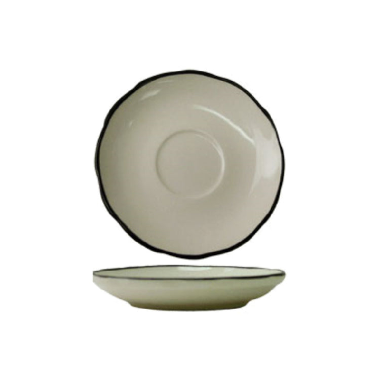 International Tableware SY-2 Saucer 5-3/4" Dia. Round is a versatile piece of ceramic dishware designed to excel in various settings, from casual dining establishments to upscale eateries. With a diameter of 5-3/4 inches, this round saucer features a distinctive scalloped edge, adding a touch of elegance to its design. Made from lead-free ceramic, it ensures safety and durability, contributing to a sustainable dining environment. Its American White color is accentuated by a black band, providing a classic yet contemporary look suitable for diverse table settings. The SY-2 Saucer is microwave and dishwasher safe, offering convenience for both serving and cleaning processes in high-volume dining facilities. Specifically designed to complement the SY-1 and SY-4 items, it enhances the overall dining presentation, ensuring a cohesive aesthetic. Each case contains three dozen saucers, making it a cost-effective choice for restaurants, hotels, and catering services. This product seamlessly blends style with practicality, meeting the rigorous demands of the food service industry while maintaining an appealing design.