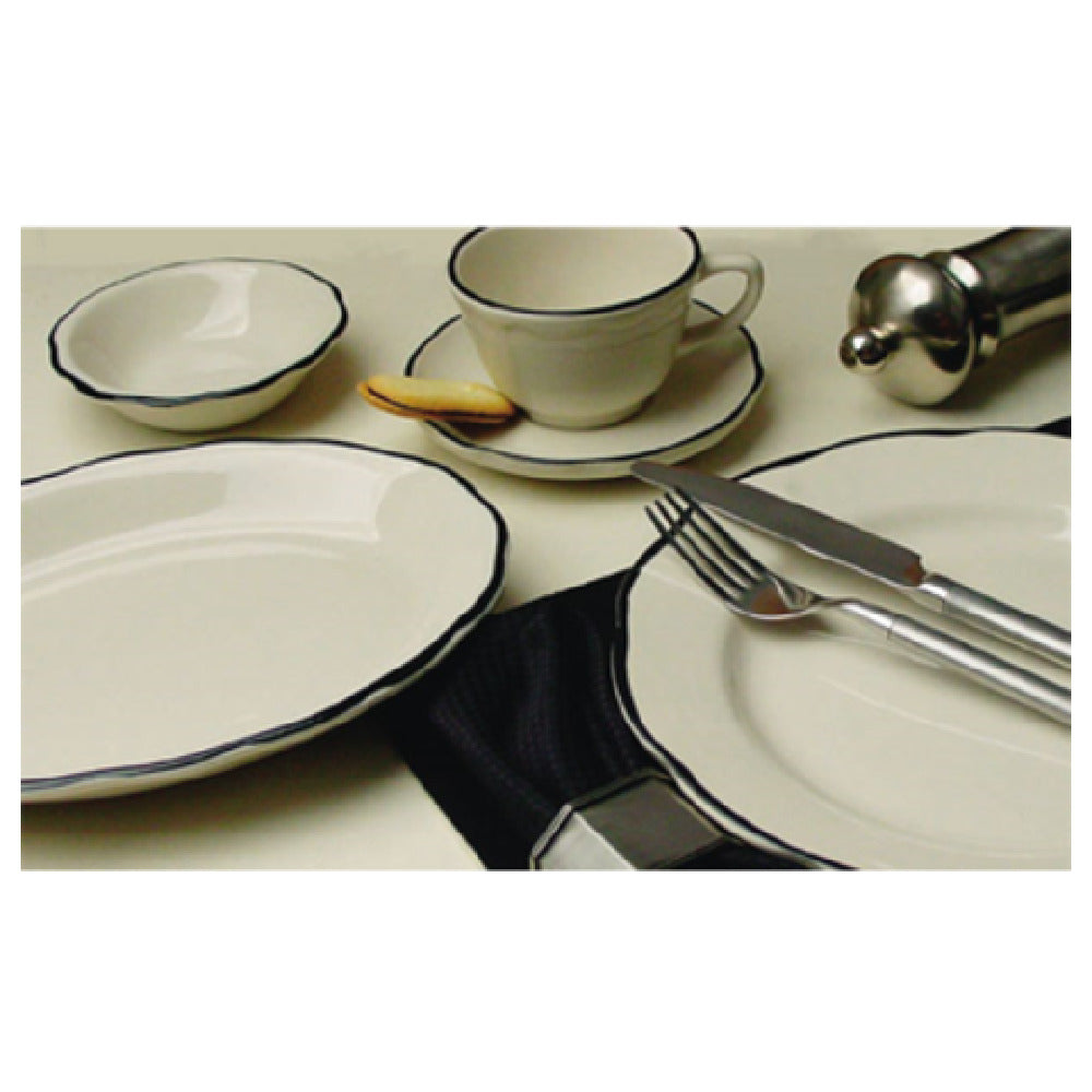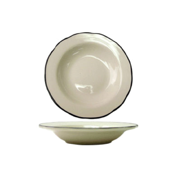 The International Tableware SY-3 Soup Bowl is crafted for both style and functionality, making it a versatile addition to any dining setting. With a generous capacity of 12 oz, this bowl is perfectly sized for serving soups, stews, and other hearty dishes. It measures 8-7/8" in diameter and stands 1-1/2" high, featuring a round shape with a deep rim to prevent spills. The scalloped edge adds a touch of elegance, enhancing the bowl's aesthetic appeal. Constructed from lead-free ceramic, this bowl ensures safe food consumption and is both microwave and dishwasher safe, offering convenience for both preparation and cleanup. The bowl is finished in American White, complemented by a striking black band, adding a classic yet modern touch to its design. The International Tableware SY-3 Soup Bowl is part of the Sydney collection and is packed by 2 dozen per case, making it an excellent choice for restaurants, hotels, and catering services that require durable and stylish tableware. Its high-quality construction and timeless design make it an ideal choice for both casual and formal dining environments, ensuring a sophisticated presentation of culinary creations across various market segments within the food service industry.