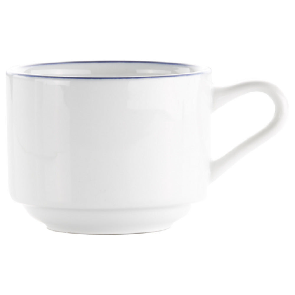 The International Tableware TB-23-CB Stacking Cup is an elegantly designed piece of tableware that holds 8 ounces, measuring 3-5/8 inches in diameter and 2-1/2 inches in height. This stacking cup features a straight-sided profile and a round shape complete with a handle, ensuring both functionality and style. Made from porcelain with underglaze decoration, it displays a classic European White color accented with blue, making it suitable for a range of dining settings from casual cafes to sophisticated restaurants. The TB-23-CB model is specifically crafted to fit seamlessly with the TB-2-CB saucer, offering a cohesive and aesthetically pleasing table presentation. As part of the Torino™ Bistro collection, this cup is packed by 3 dozen per case, making it a practical choice for hospitality businesses looking to stock durable and stylish tableware in bulk. The thoughtful design and quality materials make this stacking cup an excellent choice for commercial use, providing both durability and a touch of European elegance to any dining experience. Its ability to stack efficiently not only saves storage space but also enhances organization within high-paced food service environments.
