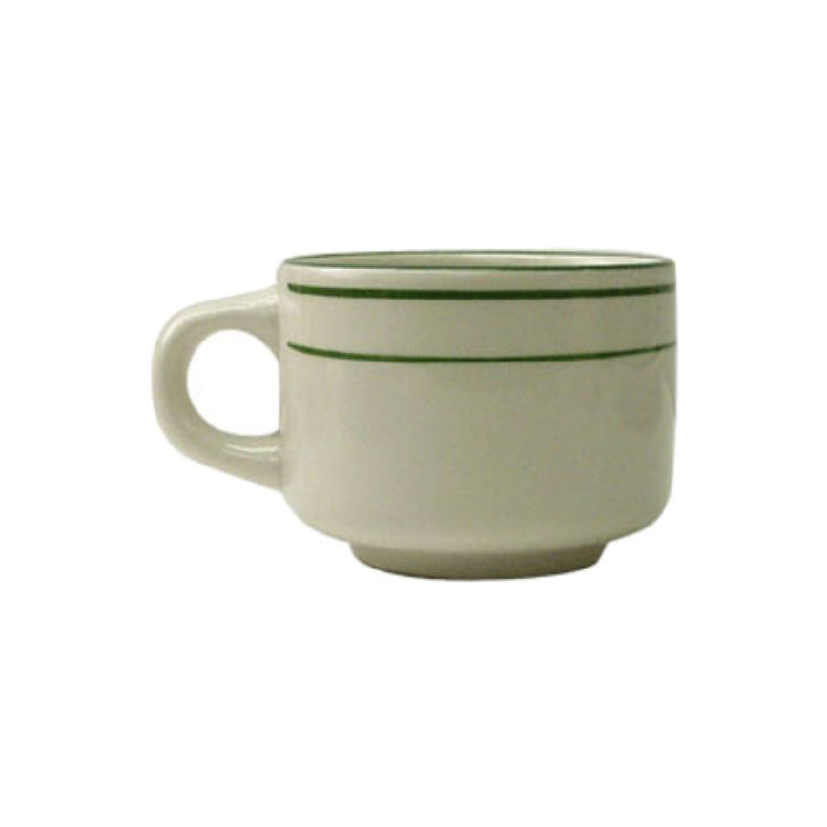 The International Tableware VE-23 Cup is a versatile dining essential, perfect for various settings, from casual dining to high-end hospitality environments. This cup boasts a capacity of 7 oz., providing just the right amount for serving tea, coffee, or any beverage of choice. With dimensions of 3-1/4" in diameter and 2-1/2" in height, it offers a comfortable and practical size for everyday use. Its round shape and sturdy handle enhance handling comfort, making it convenient for both guests and staff. The cup's stackable design optimizes storage space, which is a significant advantage for bustling kitchens and limited storage areas. Crafted from lead-free ceramic, this cup ensures safety and durability, while its American White color with a green band adds a touch of elegance and style. The Verona™ design signifies quality and aesthetic appeal, suitable for both traditional and contemporary table settings. Furthermore, the cup is microwave and dishwasher safe, enhancing its practicality in fast-paced food service environments by simplifying heating and cleaning processes. The International Tableware VE-23 Cup is packed by 3 dozen per case, offering an excellent solution for large-scale establishments looking to maintain consistent, high-quality tableware across their service areas.
