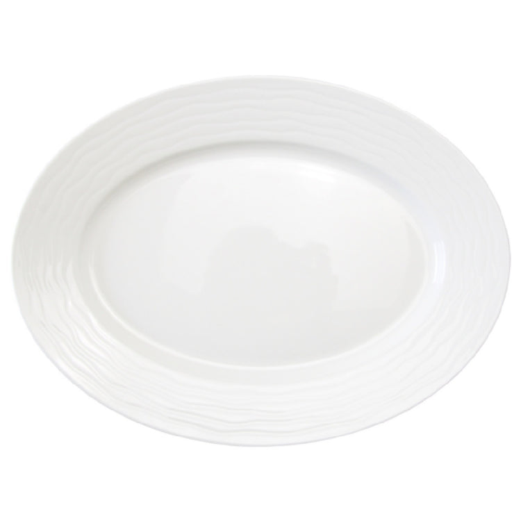 The International Tableware WA-14 Platter is a uniquely crafted porcelain dish designed with precision and elegance, characterized by its distinctive dimensions of 12-1/2 inches in length, 9-1/2 inches in width, and 1-1/2 inches in height. This oval platter showcases a wide patterned rim, adding a touch of sophistication to its bright white porcelain finish. Its Wave™ design enhances both the aesthetic appeal and functional versatility, making it suitable for various settings within the foodservice industry. Ideal for restaurants, catering services, and hospitality sectors, the platter's durable construction ensures lasting performance and reliability. The International Tableware WA-14 Platter comes packed by the dozen, offering convenience for high-volume operations. Its refined design and practicality make it an excellent choice for businesses seeking to combine style with functionality in their tableware collection.