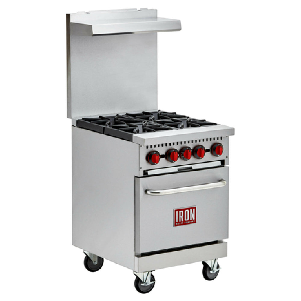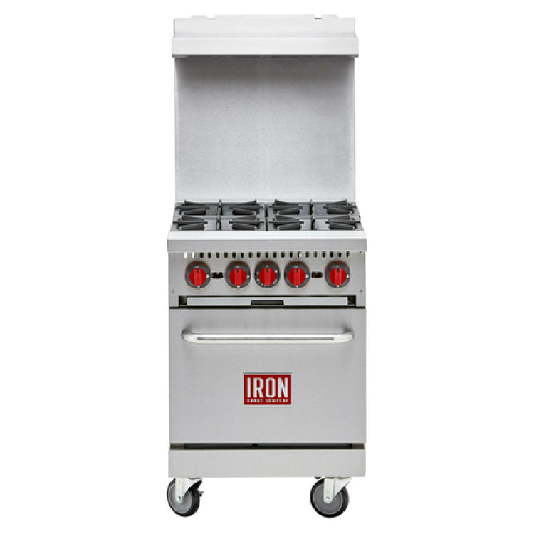 Iron Range, IR-4B, Commercial Range, natural gas, 24"W, (4) 30,000 BTU open burners, removable cast iron grates, (1) standard oven, (2) adjustable oven racks, adjustable thermostat, removable crumb tray, 250°F to 550°F temperature range, stainless steel front, sides, backriser, & shelf, 6" swivel casters, 150,000 BTU, cETLus, ETL-Sanitation (ships with LP conversion kit)