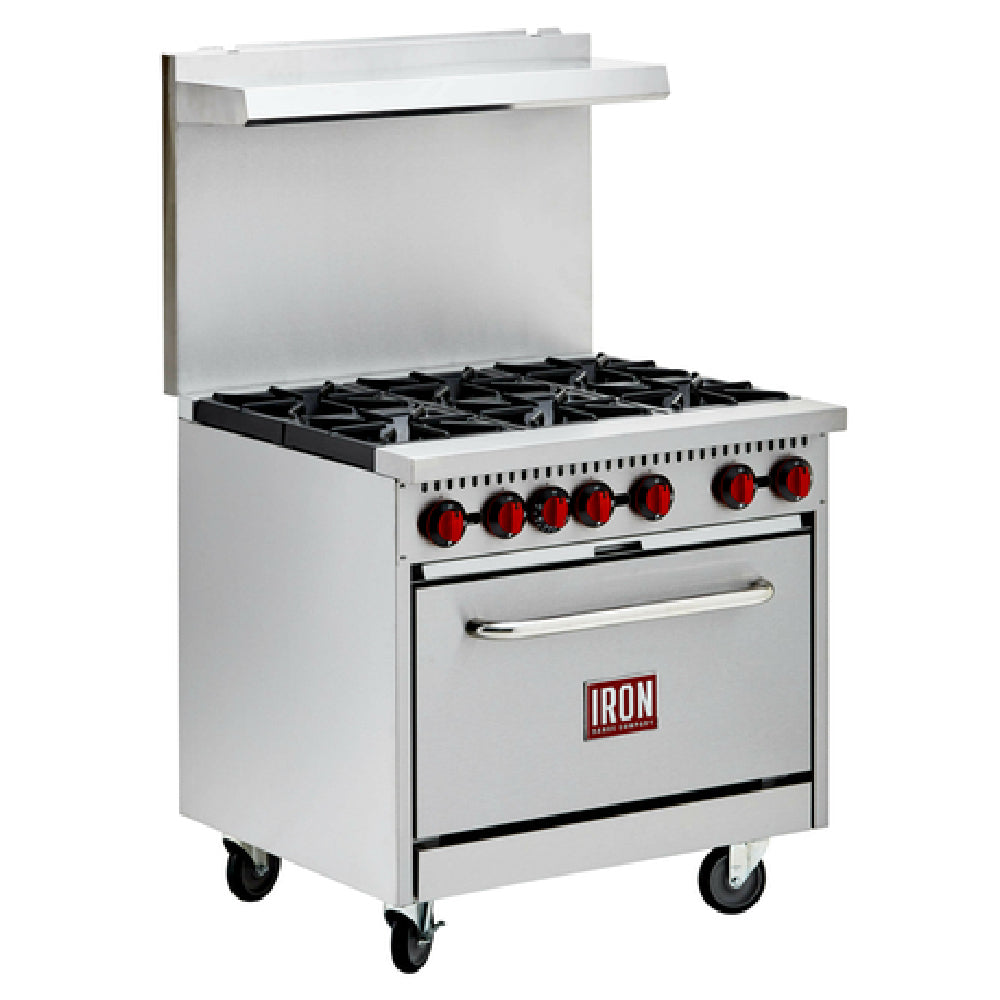 Iron Range, IR-6B, Commercial Range, natural gas, 36"W, (6) 30,000 BTU open burners, removable cast iron grates, (1) standard oven, (2) adjustable oven racks, adjustable thermostat, removable crumb tray, 250°F to 550°F temperature range, stainless steel front, sides, backriser, & shelf, 6" swivel casters, 210,000 BTU, cETLus, ETL-Sanitation (ships with LP conversion kit)
