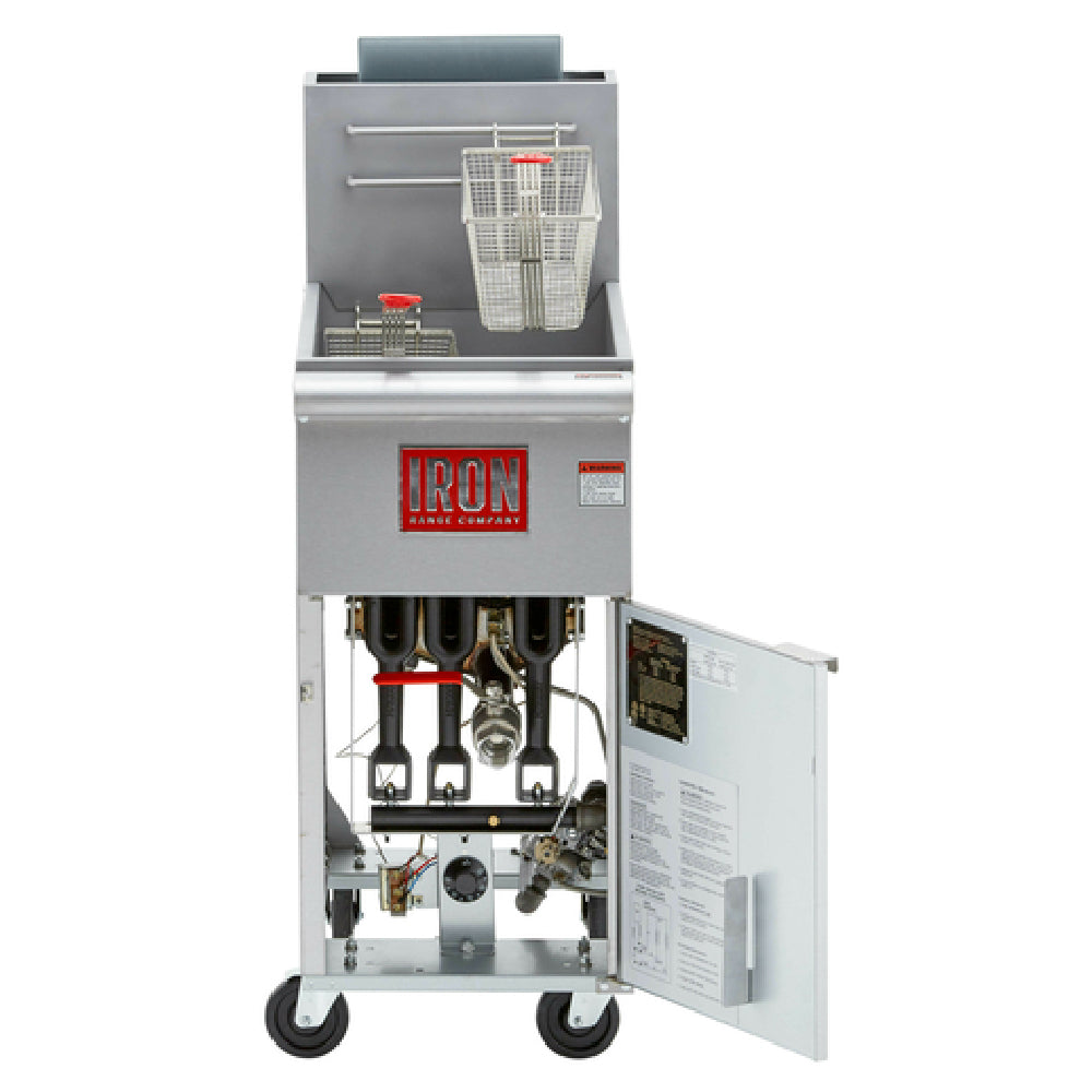 Iron Range, IRF-40 NAT, Fryer, natural gas, floor model, 40 lb. oil capacity, 1-millivolt thermostat, 200°F - 400°F temperature range, (3) heat tubes 30,000 BTU each, (2) nickel plated baskets, auto reset high limit control, stainless steel front, sides, door & tank, stainless steel flue riser, 1-1/4" ball type full port drain valve, 5" casters, 90,000 BTU total, cETLus, ETL-Sanitation