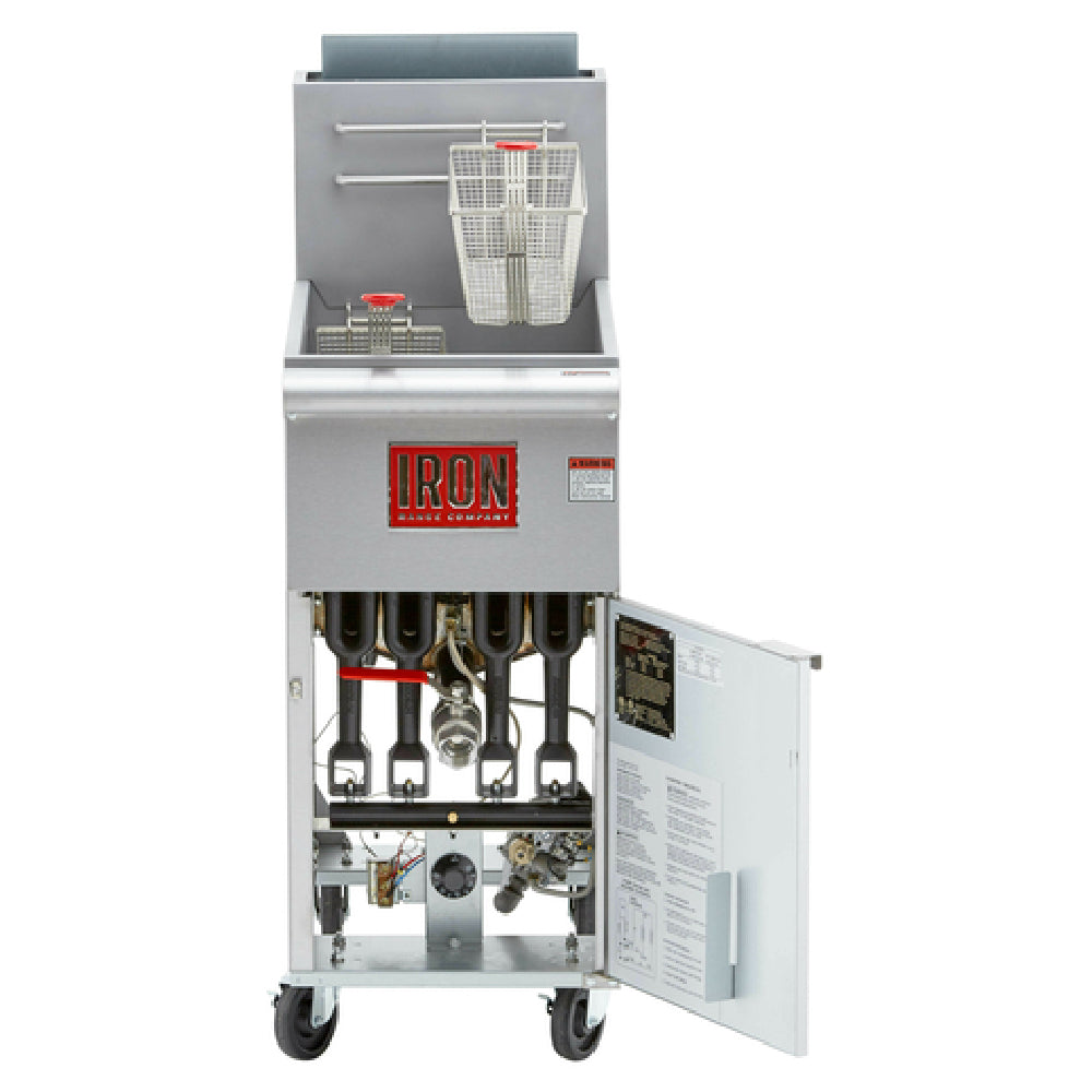 Iron Range, IRF-50 LPG, Fryer, liquid propane gas, floor model, 50 lb. oil capacity, 1-millivolt thermostat, 200°F - 400°F temperature range, (4) heat tubes 30,000 BTU each, (2) nickel plated baskets, auto reset high limit control, stainless steel front, sides, door & tank, stainless steel flue riser, 1-1/4" ball type full port drain valve, 5" casters, 120,000 BTU total, cETLus, ETL-Sanitation