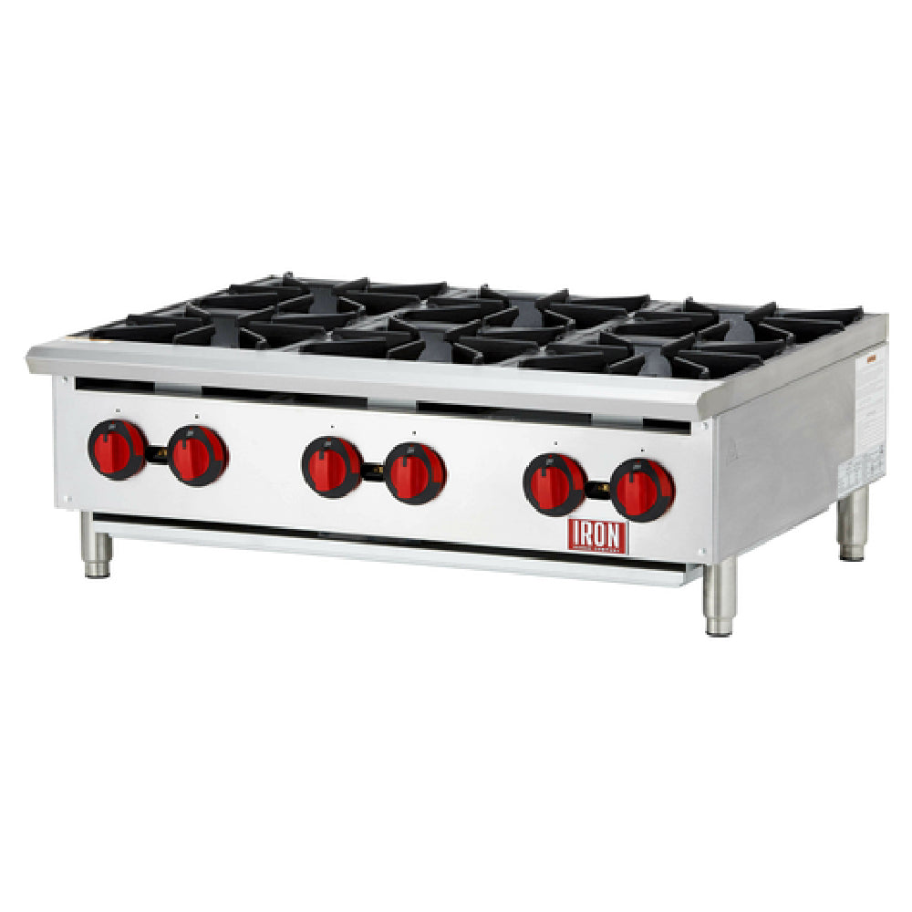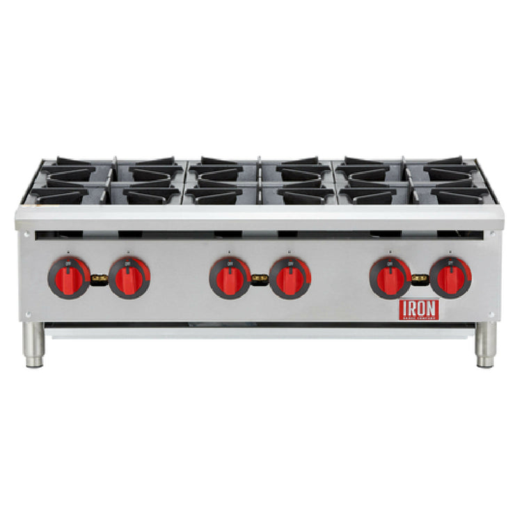 Iron Range, IRHP-36-6B, Hotplate, natural gas, countertop, 36"W, (6) 25,000 BTU open burners, lift-off top, removable cast-iron grates, individual pilots with front access, independent temperature control knobs, removable stainless steel grease catch pan, stainless steel front & sides, 4" adjustable non-skid stainless steel legs, 150,000 BTU, cETLus, ETL-Sanitation (ships with LP conversion kit)
