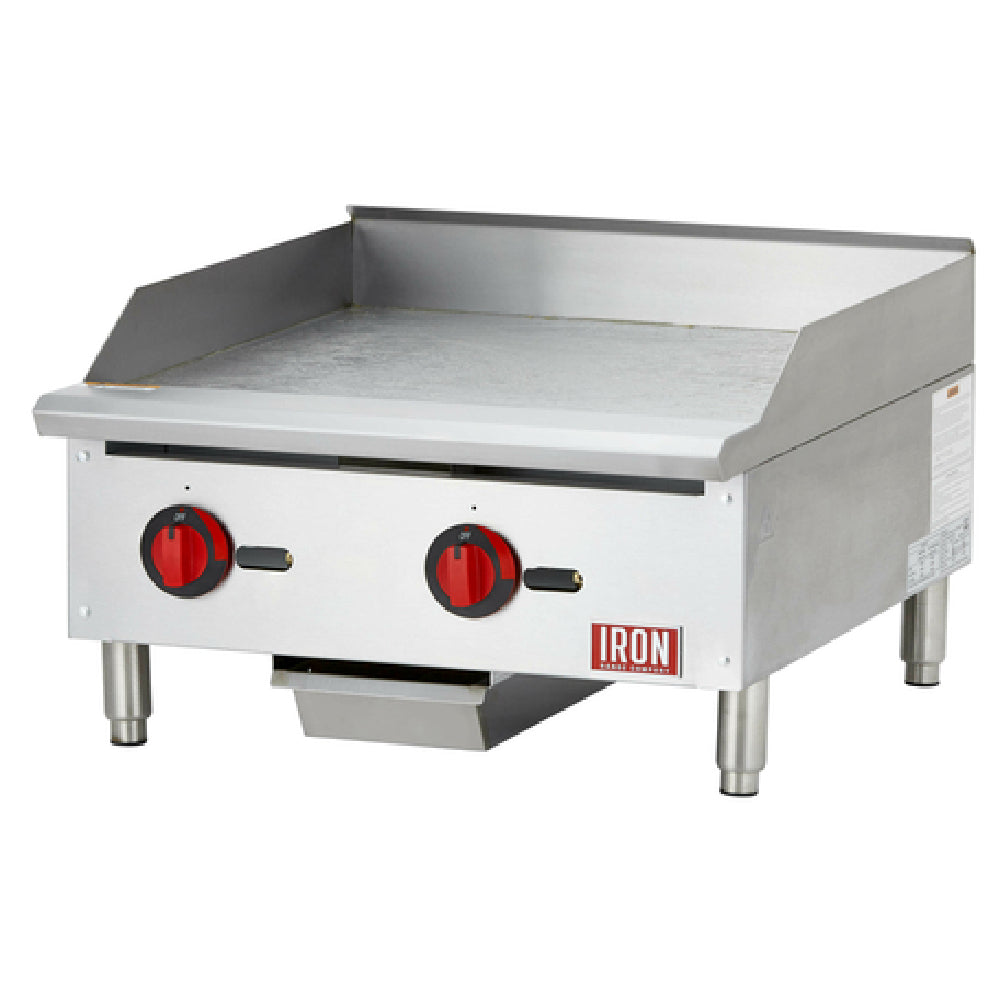 Iron Range, IRMG-24, Commercial Griddle, natural gas, countertop, 24"W, manual controls, 24"W x 21"D cooking area, 3/4" thick smooth steel plate, 4" backsplash & sidesplash, removable stainless steel grease pan, stainless steel front, sides & backsplash, 4" adjustable non-skid stainless steel legs, 60,000 BTU, cETLus, ETL-Sanitation (ships with LP conversion kit)