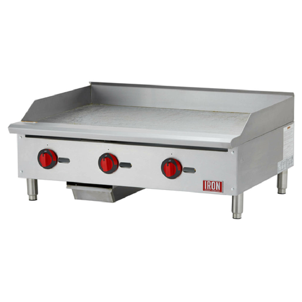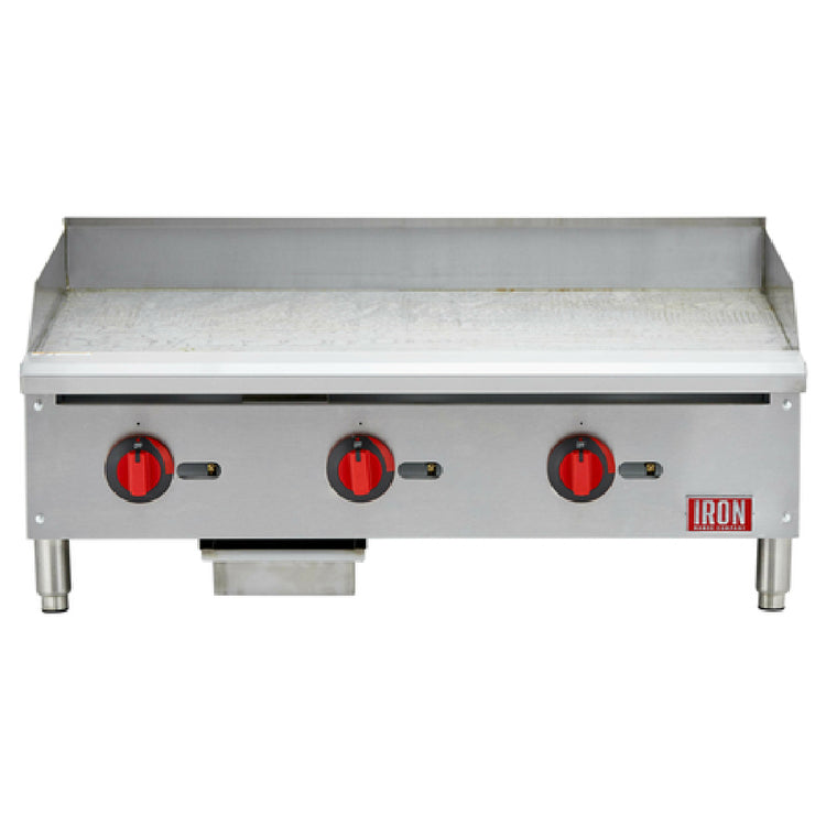 Iron Range, IRMG-36, Commercial Griddle, natural gas, countertop, 36"W, manual controls, 36"W x 21"D cooking area, 3/4" thick smooth steel plate, 4" backsplash & sidesplash, removable stainless steel grease pan, stainless steel front, sides & backsplash, 4" adjustable non-skid stainless steel legs, 90,000 BTU, cETLus, ETL-Sanitation (ships with LP conversion kit)