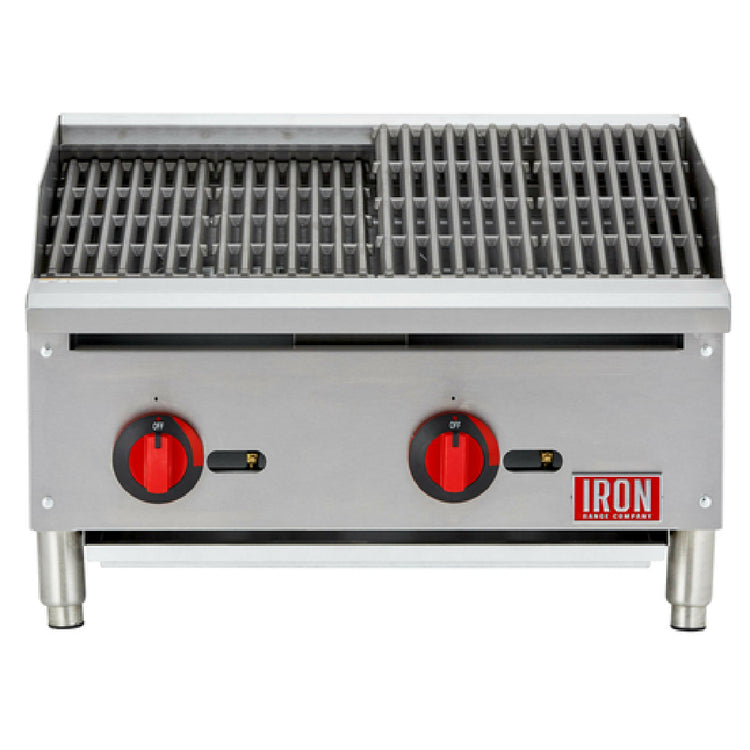 Iron Range, IRRB-24, Radiant Charbroiler, natural gas, countertop, 24", (2) stainless steel burners, individual pilots with front access, stainless steel radiant plates, adjustable cast iron grates, manual controls, 4" backsplash & sidesplash, removable grease pan, stainless steel front, sides & backsplash, 4" adjustable non-skid stainless steel legs, 70,000 BTU, cETLus, ETL-Sanitation (ships with LP conversion kit)