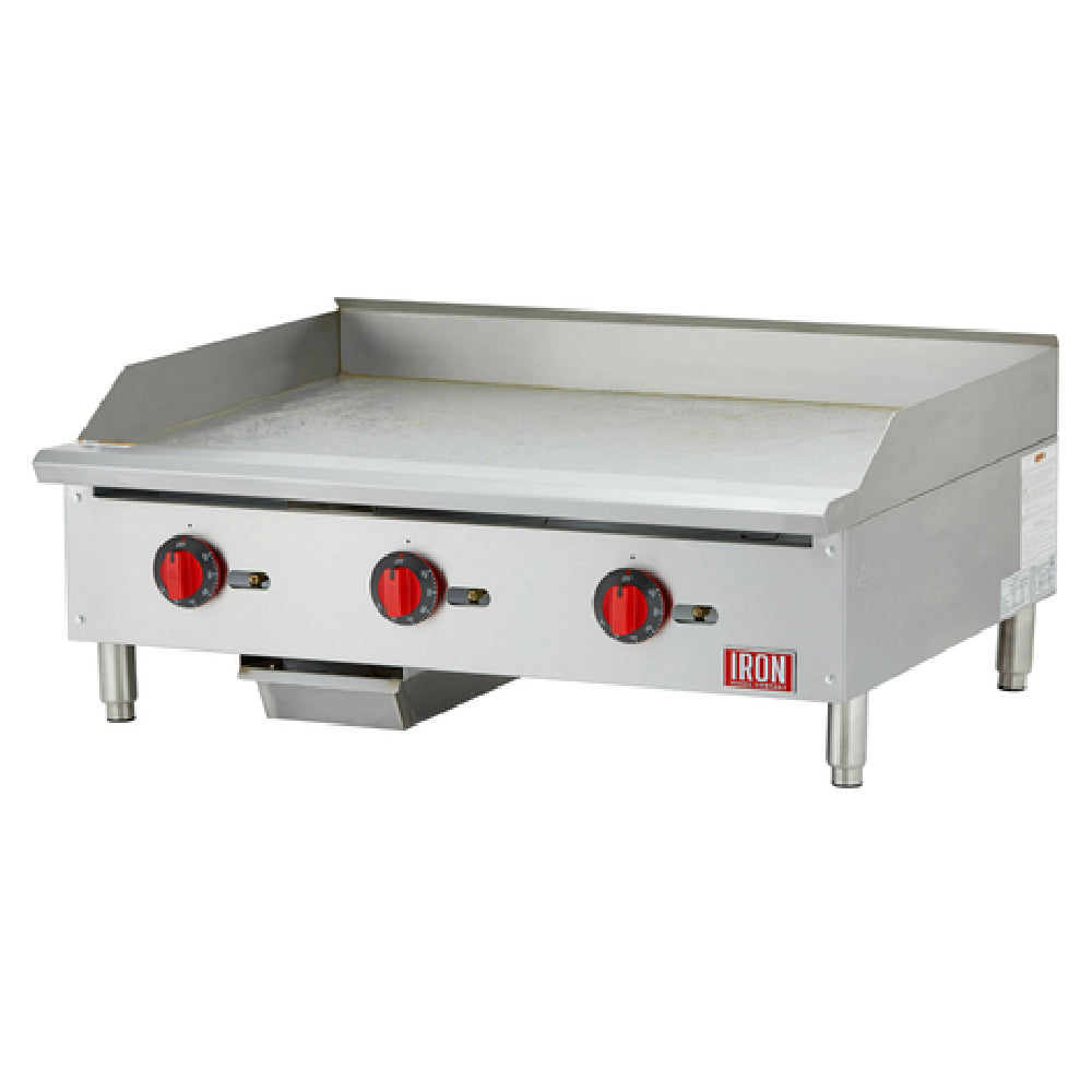 Iron Range, IRTG-36, Commercial Griddle, natural gas, countertop, 36"W, thermostatic controls, 36"W x 21"D cooking area, 3/4" thick smooth steel plate, 4" backsplash & sidesplash, removable stainless steel grease pan, stainless steel front, sides & backsplash, 4" adjustable non-skid stainless steel legs, 90,000 BTU, cETLus, ETL-Sanitation (ships with LP conversion kit)
