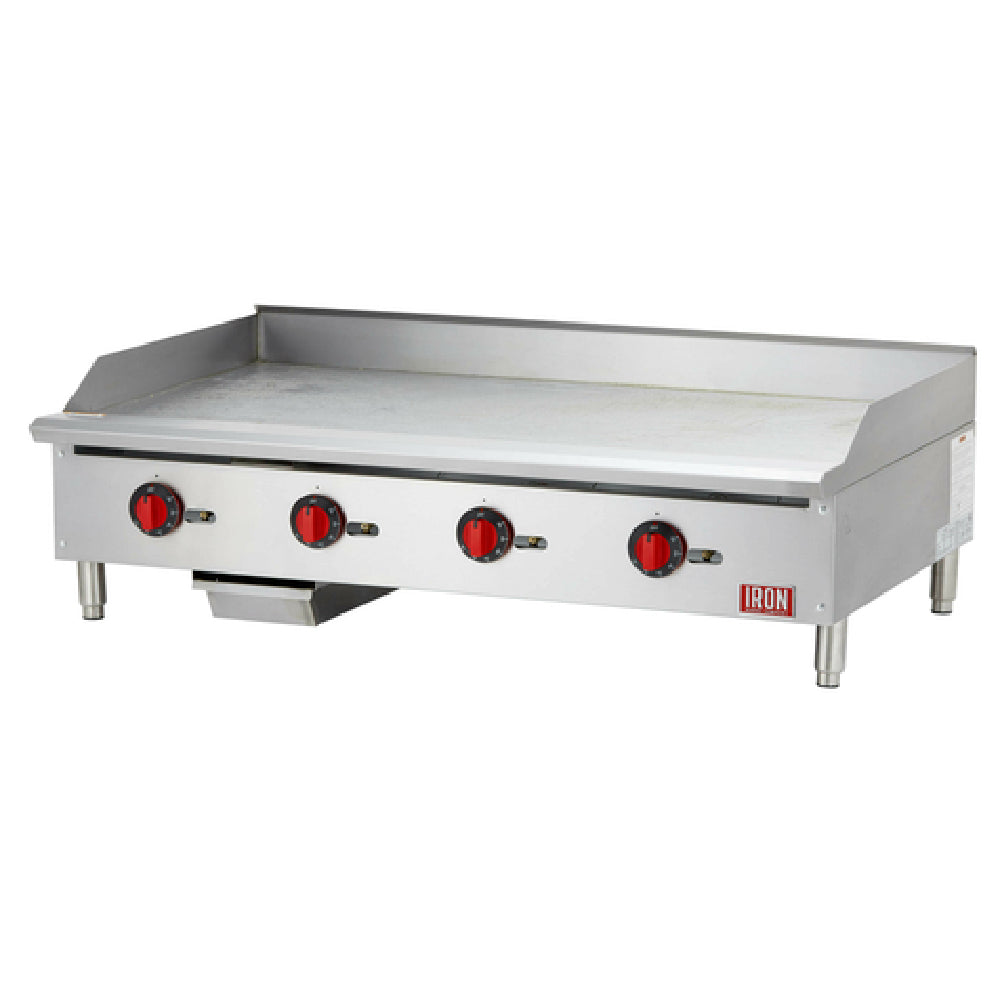 Iron Range, IRTG-48, Commercial Griddle, natural gas, countertop, 48"W, thermostatic controls, 48"W x 21"D cooking area, 3/4" thick smooth steel plate, 4" backsplash & sidesplash, removable stainless steel grease pan, stainless steel front, sides & backsplash, 4" adjustable non-skid stainless steel legs, 120,000 BTU, cETLus, ETL-Sanitation (ships with LP conversion kit)