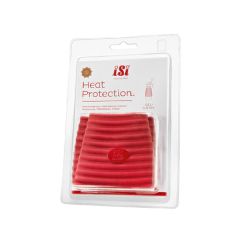 The ISi North America 271901 Heat Protection Sleeve for pint-sized whips (160301) is a specialized accessory designed for enhancing the safety and efficiency of culinary operations involving whipped cream dispensers. Crafted from high-quality, BPA-free silicone, this heat protection sleeve comes in a vibrant red color, ensuring both durability and ease of identification in busy kitchen environments. Its non-slip feature provides a secure grip, minimizing the risk of accidents when handling hot or cold whips. This product is dishwasher safe, promoting effortless cleaning and maintaining hygiene standards expected in professional kitchens. Each pack contains three sleeves, with six packs available per case, allowing for bulk purchasing suited to large-scale food service establishments. This sleeve is particularly valuable for pastry chefs and culinary professionals who utilize pint-sized whips, providing essential heat protection and contributing to a safer, more efficient workflow. The ISi North America 271901 Heat Protection Sleeve represents an optimal solution for professionals seeking reliable and safe tools to accompany their kitchen equipment, aligning with industry standards for safety and quality.