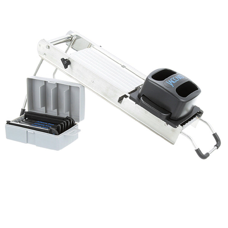 Jaccard 200441 Jaccard Safe Hands Stainless Steel Mandolin With Ceramic, Blades., Dial-a-slice Thickness Adjustment System Simplifies Setting, Thickness Levels With Ranges From 1 To 8mm., Includes 7 Interchangable Blade Cartridges, -straight Blade, -waffle Blade, -(5) Julienne Blades (2mm 4mm 6mm 8mm 10mm)., Dishwasher Safe. Limited Lifetime Warranty.