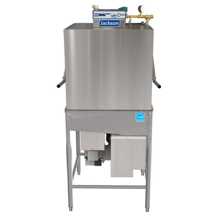 The Jackson NXP-HTD Dishwasher is a high-temperature, door-type unit designed for robust performance in commercial settings. Featuring an electric tank heat system and a built-in 70°F booster with Sani-Sure™, it ensures effective sanitation. This dishwasher accommodates approximately 58 racks per hour, using just 0.89 gallons per rack, making it an efficient choice for high-volume operations. Its universal design supports both straight-thru and corner configurations, while the automatic tank fill and door-actuated start enhance user convenience. The unit includes a digital temperature display and a delime cycle for easy maintenance. With a 17-1/4” vertical chamber clearance, it offers flexibility in loading. The interchangeable upper and lower wash/rinse arms, vent fan control, and hi-limit thermostat provide optimal washing conditions. The low water protection and detergent/rinse additive signal connection fuse box ensure safe operation. Powered by a 1 HP stainless steel wash pump motor and built with a stainless steel exterior, it is both durable and reliable. Adjustable bullet feet add to its adaptability in diverse kitchen environments. The Jackson NXP-HTD is cETLus and ETL-Sanitation listed and ENERGY STAR® certified, making it a sustainable choice for businesses mindful of efficiency and environmental impact, though it is not eligible for certain start-up and warranty extensions.