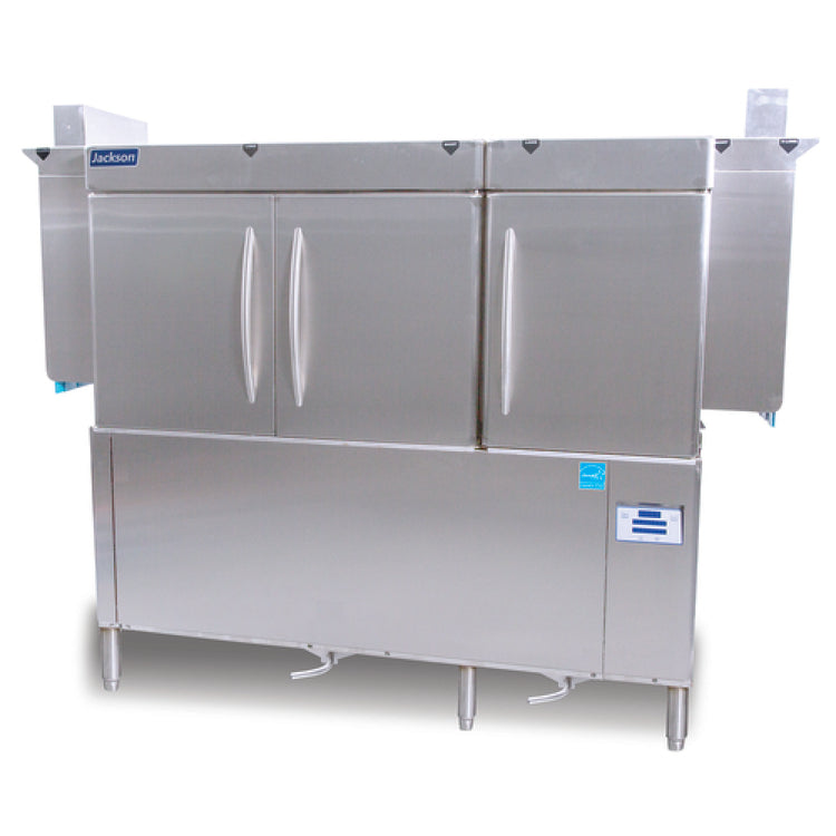 The Jackson RACKSTAR 66CE_230/60/1 RackStar® 66 Dishwasher is a conveyor-type, high-temperature sanitizing unit with an electric tank heat system, meticulously engineered for high-demand environments. This single-tank powerhouse boasts a 22-inch pre-wash and can handle approximately 223 racks per hour, utilizing a mere 0.35 gallons per rack, optimizing water efficiency. The fully automatic operation features an auto-fill system and a digital temperature readout for precise monitoring. The machine's front is equipped with double-wall insulated doors, enhancing thermal retention and energy efficiency. It incorporates EnergyGuard™ controls and offers a Dual Rainbow Rinse™ system with Econo (0.35 gpr) or Turbo (0.51 gpr) options for tailored performance. Additional features include a vent cowl collar with an adjustable damper, vent fan control, and a strike plate table limit switch for operational ease. Splash shields and durable stainless steel construction ensure longevity and hygiene, while adjustable bullet feet provide stability. The robust 3 HP pump and 1/4 HP conveyor underscore its industrial-grade capabilities. Certified by cETLus and ETL-Sanitation, this dishwasher is a reliable choice for various markets, from bustling restaurants to large-scale catering services, offering exceptional efficiency and sanitation standards.