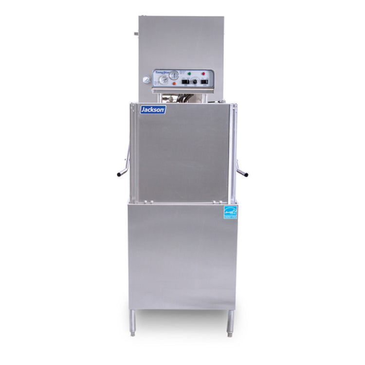 The Jackson TEMPSTAR HH-E VENTLESS (VER)_230/60/1 TempStar® Dishwasher High Hood is a cutting-edge solution for commercial kitchens seeking efficiency and innovation. This door-type dishwasher features a high hood design, making it versatile for handling a variety of dishware sizes. Equipped with ventless and energy recovery technology, it optimizes water usage with a remarkable consumption rate of only 0.72 gallons per rack, processing approximately 37 racks per hour. The high-temperature electric tank heat is complemented by a built-in 70°F booster, ensuring superior sanitation. Its stainless steel exterior not only enhances durability but also provides a sleek, professional appearance. The dishwasher's electromechanical controls offer reliability and ease of use, while the multi-cycle timer accommodates different washing needs. With the ability to be field converted from a straight-through to a corner configuration, it adapts to diverse kitchen layouts. The inclusion of a pressure regulator supports seamless integration during installation. Certified by cETLus, ETL-Sanitation, and ENERGY STAR®, this appliance underscores its commitment to energy efficiency and sanitation. Note that the dishtable is not included, and assembly is required, making the Jackson TEMPSTAR HH-E VENTLESS a flexible and efficient choice for high-demand commercial environments.