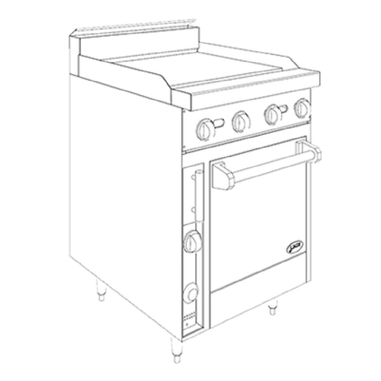 The Jade Range JBR-24G-24_NAT Bistro™ Restaurant Range is a versatile and powerful addition to any commercial kitchen. This gas-powered range features a 24-inch griddle with a robust 1-inch thick polished steel plate, ideal for consistent heat distribution and durability. With manual controls, it provides chefs with direct and precise operation, although it does not include a temperature thermostat. The range is equipped with a standard oven that comes with a chrome-plated rack, enhancing its utility for baking and roasting tasks. Its stainless steel front, sides, tray bed, and stub back ensure longevity and a sleek appearance, suitable for a professional kitchen environment. Supported by 6-inch adjustable legs, it offers customizable height options to suit various countertop levels. With a total output of 78,000 BTU, this range delivers substantial cooking power. Certified by CSAus and NSF, it meets rigorous safety and sanitation standards. The Jade Range JBR-24G-24_NAT is an efficient and durable choice for restaurant and bistro settings seeking reliable performance and high-quality construction in their kitchen appliances.