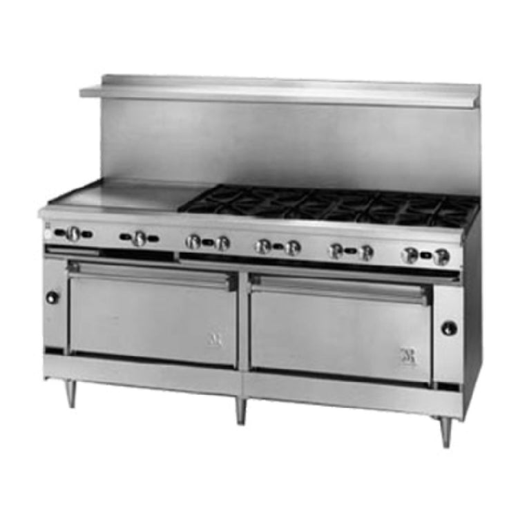 The Jade Range JBR-36G-36 Bistro™ Restaurant Range - Gas 36" is a robust kitchen appliance meticulously engineered for high-performance cooking in commercial kitchens. This versatile unit features a 36-inch griddle with a 1-inch thick polished steel plate, ensuring durability and even heat distribution for precise cooking results. The manual controls, devoid of a temperature thermostat, offer chefs the flexibility to adjust heat levels according to their specific cooking requirements. The standard oven, inclusive of a single chrome-plated rack, provides ample space for baking and roasting. Constructed with a stainless steel front, sides, tray bed, and stub back, the range is designed for longevity and easy maintenance. The range is supported by 6-inch adjustable legs, allowing for customizable installation and enhanced stability. With an impressive output of 102,000 BTU, this gas range delivers powerful performance suited for bustling restaurant environments. Certified by CSAus and NSF, the Jade Range JBR-36G-36 meets stringent safety and quality standards, making it a reliable choice for chefs and restaurant operators who demand efficiency and excellence in their culinary operations. Its blend of high capacity, robust construction, and precision control makes it a valuable asset in any professional kitchen.